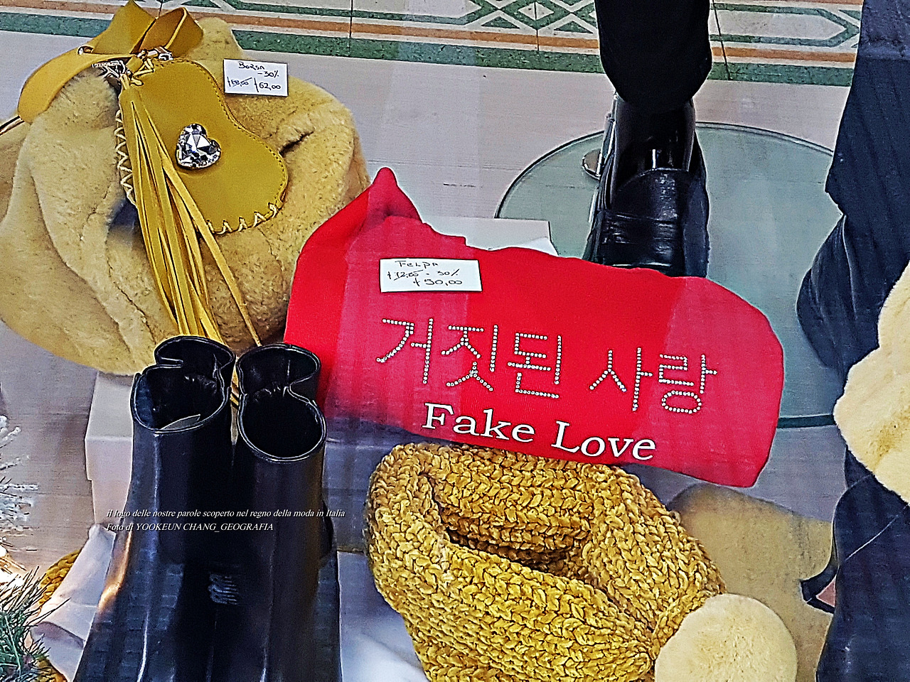 이 같은 느낌은 지난 성탄 전야에 도드라졌다. 이날은 바를레타 재래시장에 장을 보러 가던 중이었다. 시내 중심의 한 옷가게 쇼윈도에서 '거짓된 사랑, Fake Love)'이라 적힌 우리말 로고를 발견한 것이다. 반가웠다. 피렌체서 살 때 어쩌다 우리말 로고가 새겨진 외투를 입은 젊은이를 본적 있었다. 그러나 쇼윈도에 진열된 옷은 처음 발견한 것이다.