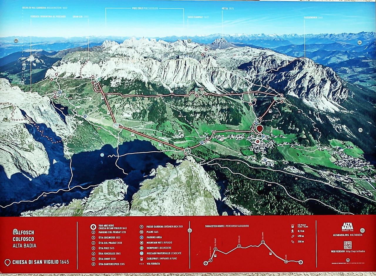 이밖에도 알타 바디아의 관련 사이트에는 난이도 초급에서부터 고급에 이르기까지 다양한 코스를 준비해 놓고 있으므로 돌로미티 여행을 계획하시는 분들이라면 눈여겨봐 두셔야 할 것 같다. 참고로 말씀드리면 각 코스를 다녀오는 동안 우리가 다녀온 리푸지오 삐쉬아두 정상에서 바라봤던 비경들 속으로 이어지고 있다는 것. 병풍처럼 둘러 쳐진 장엄한 바위산과 숲을 끼고 코스들이 이어지고 있는 것이다. 위 자료사진은 라 빌라의 마을에 세워놓은 알타 바디아의 명소를 소개하는 이정표이다. 우리가 다녀온 곳은 사진의 좌측에 위치한(9번) 빠쏘 가르데나(Passo Gardena)이다. 다시금 돌아봐도 꿈만 같다.