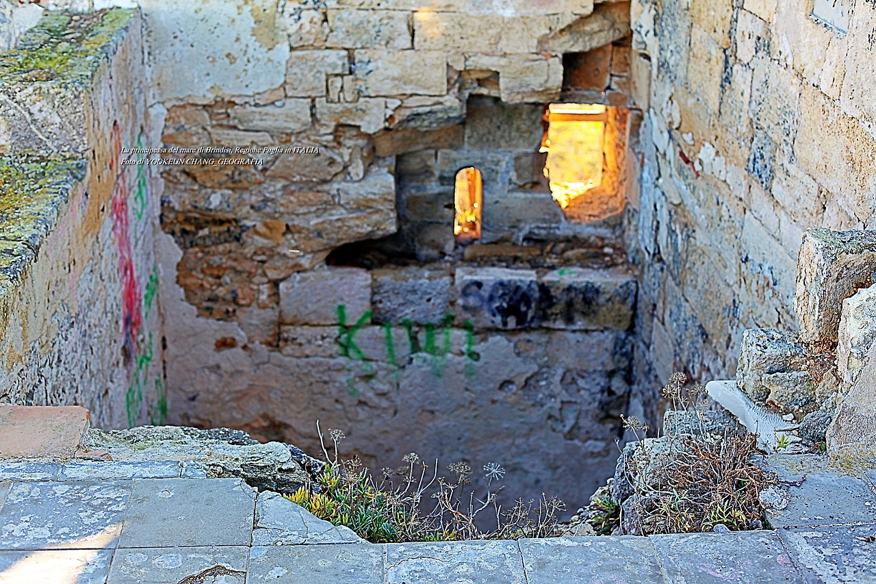 전망대에 도착하자마자 눈길을 끈 것은 위층으로 올라가는 돌계단이었다. 석회석으로 만들어진 돌계단은 사람들의 왕래 때문이 아니라 세월의 무게를 이기지 못해 풍상에 녹아내려 움푹 파였다. 아래서 상하좌우 겉모습을 관찰한 결과 사람들이 들어가 본 흔적이 남아있었다. 어떤 녀석들이 이곳에 머물면서 스프레이로 낙서를 해 놓은 것을 보면 브린디시 시 당국 조차 별로로 여기는 유적이라나 할까.