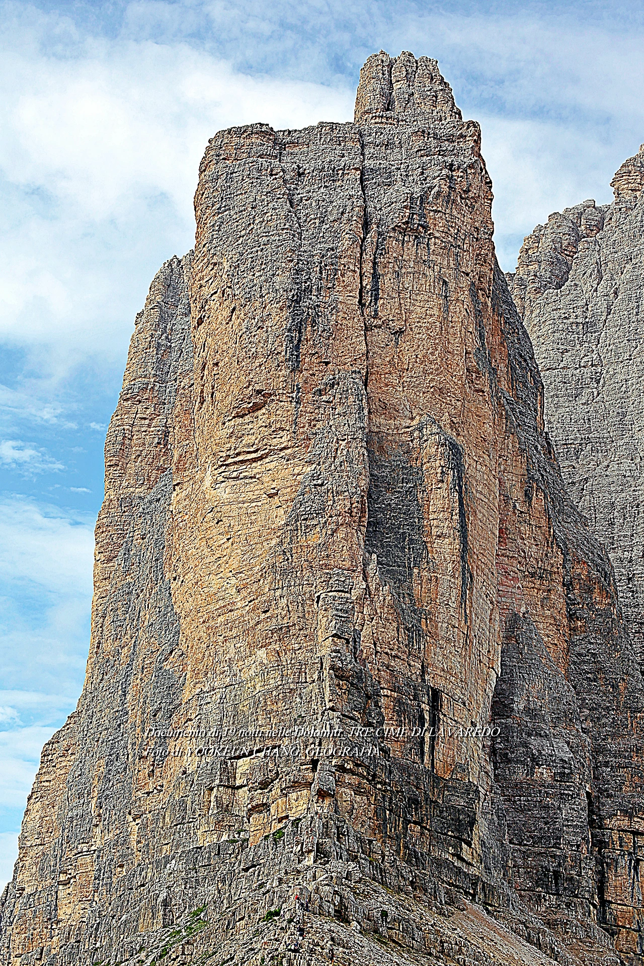 세 봉우리는 가장 작은 봉우리(Cima piccola, 2,857m)와 가장 큰 봉우리(Cima grande, 2,999m) 및 동쪽에 위치한 중간 봉우리(Cima ovest, 2,973m)로 구성돼 있다. 지금 보고 있는 봉우리는 방위상 가장 작은 봉우리에 해당한다. 가까이에서는 크기를 가늠할 수 없을 정도이며, 곧 만나게 될 두 번째 쉼터까지 멀리 떨어져야 조망이 가능하다. 이때 뜨레 치메의 진면목을 알 수 있게 된다.