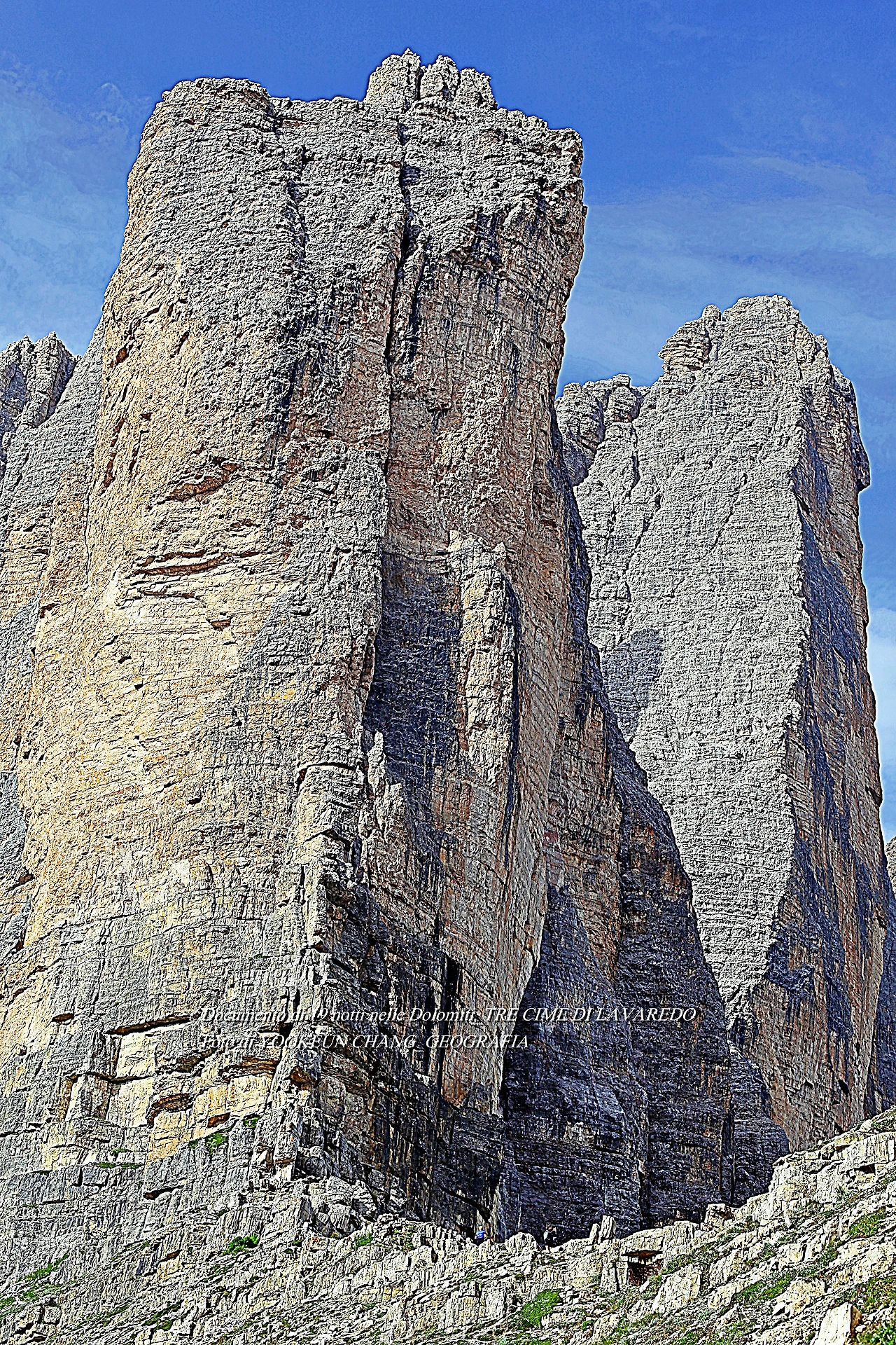 하니가 올려다보고 있는 곳은 장엄함 그 이상을 두른 채 우뚝 솟아있는 뜨레 치메(Tre cime_cime는 cima의 복수형이다)란 '세 봉우리'를 말한다. 사람의 모습이 숨은 그림 찾기처럼 눈에 잘 띄지도 않는다. 우리는 어느덧 세 봉우리 곁까지 진출한 것이다. 이곳에 서면 진풍경을 카메라에 담을 수 없을 정도로 난관에 부딪치게 된다.