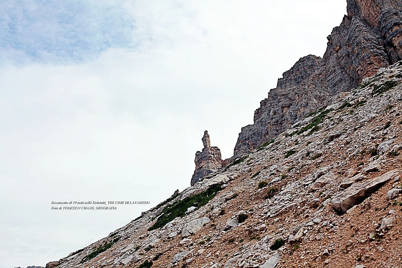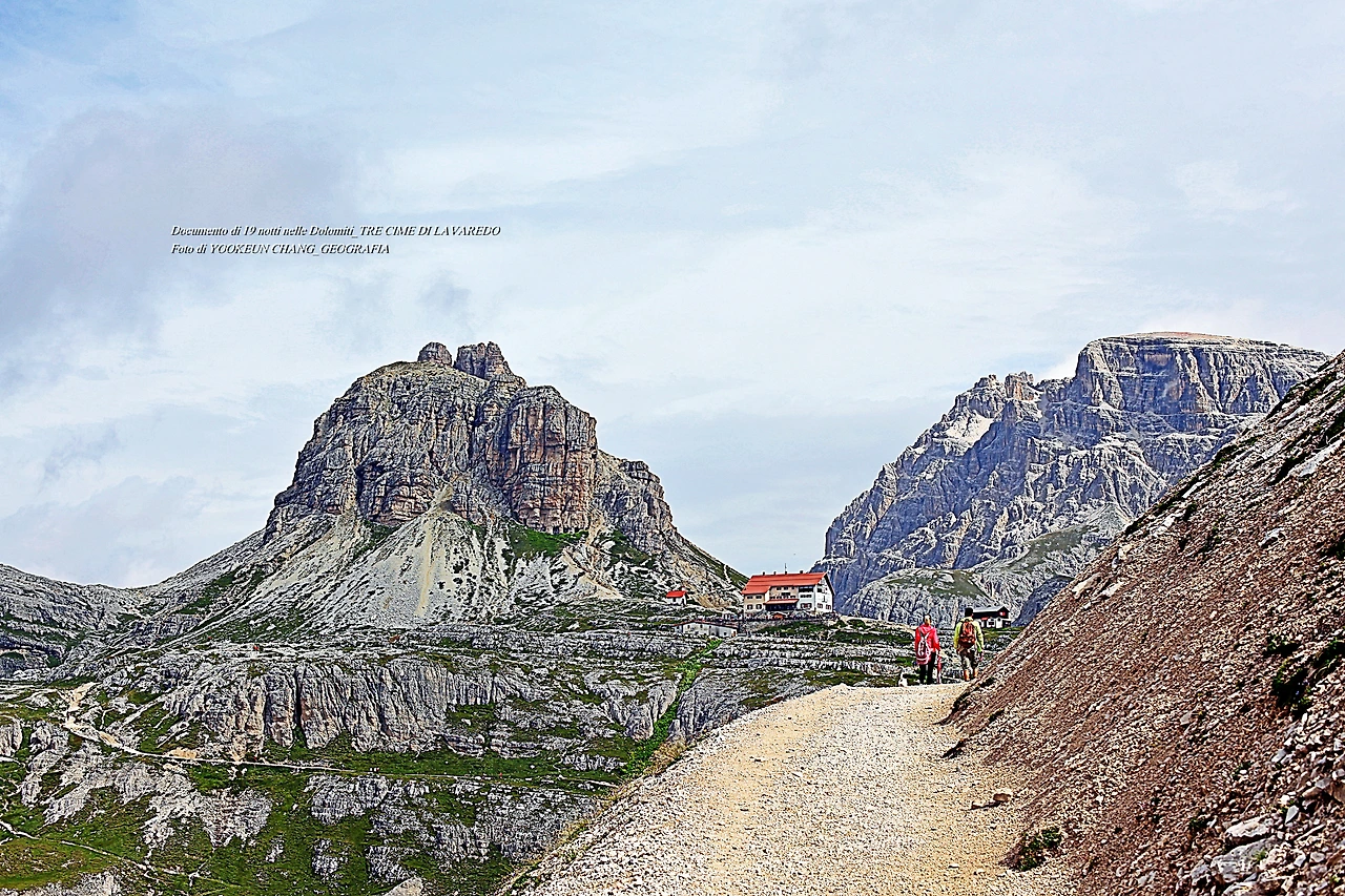 이른 아침부터 부지런히 발품을 팔며 걸었더니 저만치 뜨레 치메 디 라바레도의 쉼터(Rifugio Auronzo alle Tre Cime di Lavaredo)가 손에 잡힐 듯 가깝다. 하니와 나는 곧 쉼터에 도착할 것이다. 그동안 나는 돌로미티의 대표선수라 일컫는 세 봉우리를 가끔씩 뒤돌아 봤다. 뷰파인더의 앵글에 세 봉우리를 통째로 담아볼 요량으로 걸음을 걸으면서 적당한 시간이 되면 다시 돌아보는 것이다. 새 봉우리 곁을 떠나면서 이 같은 동작은 반복되었다.