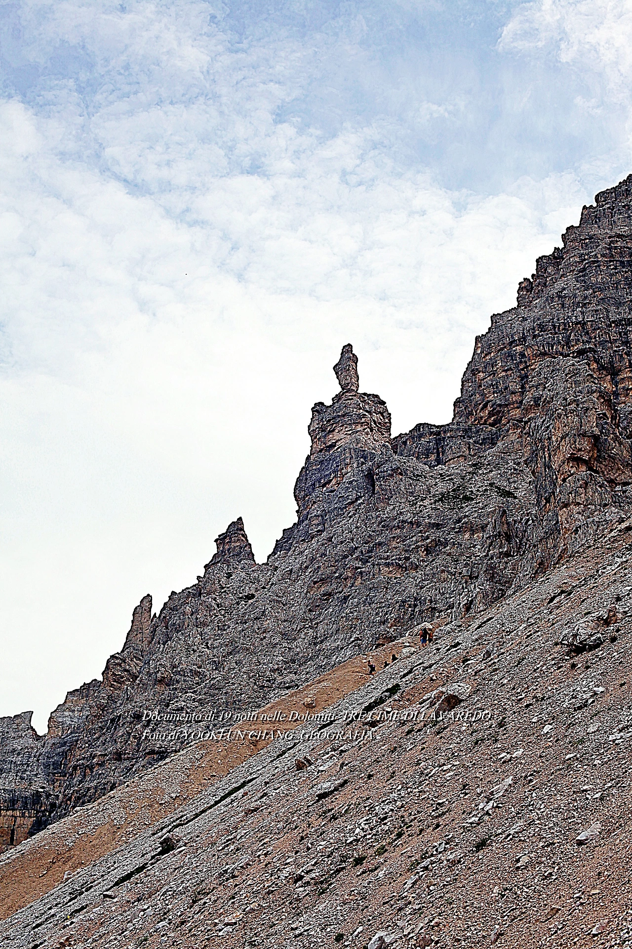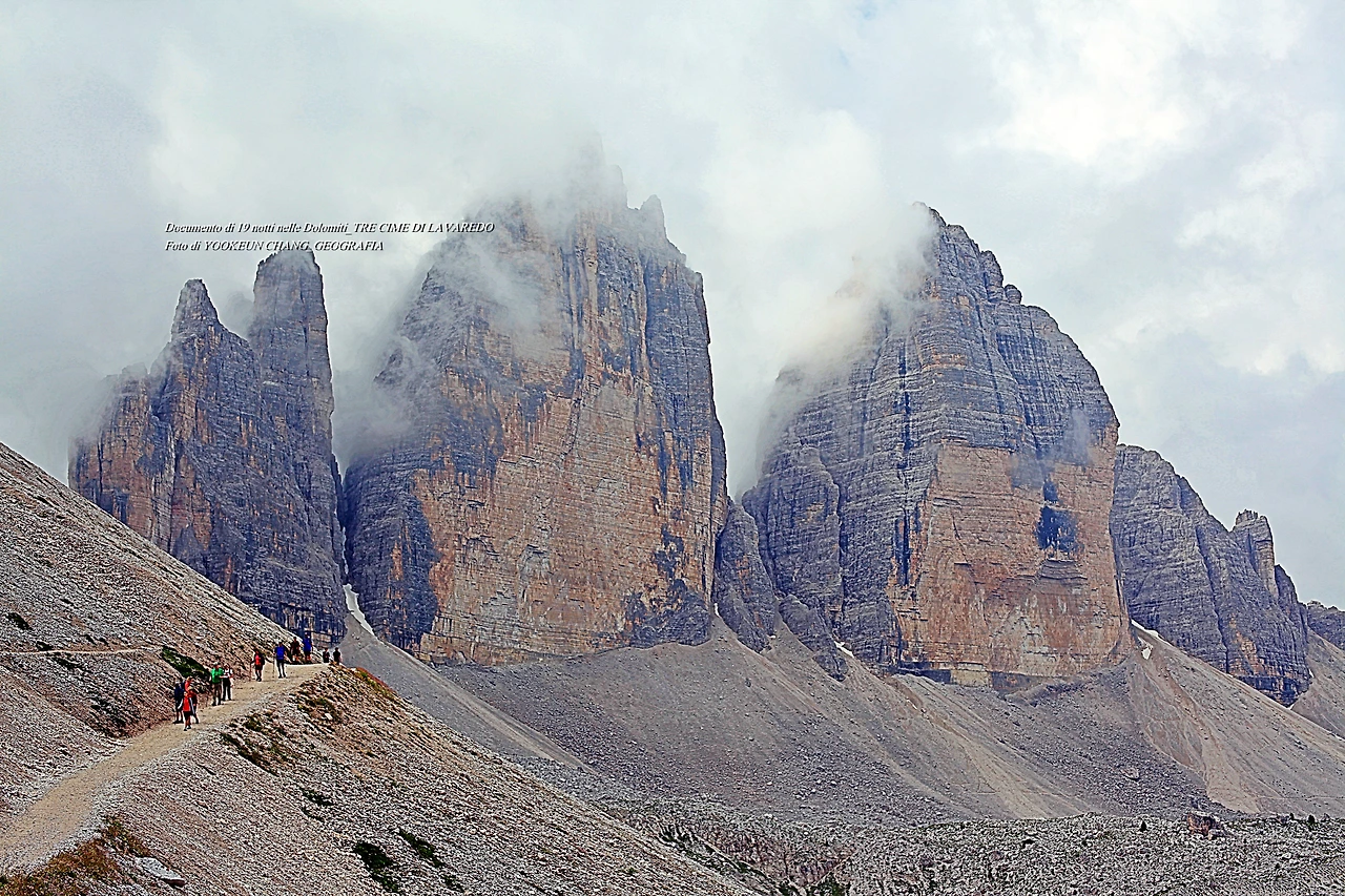 돌로미티 여행 사진첩을 열어놓고 보니 그 속에 눈에 잘 보이지도 않는 티끌만 한 사람들이 둘레길을 걷고 있다. 그리고 구름 속에서 빼꼼히 그들을 지켜보고 있는 장엄하기 짝이 없는 세 봉우리.. 이곳에 서면 당신의 등 뒤에 든든한 후원자가 있음을 느끼게 되는 것이랄까..