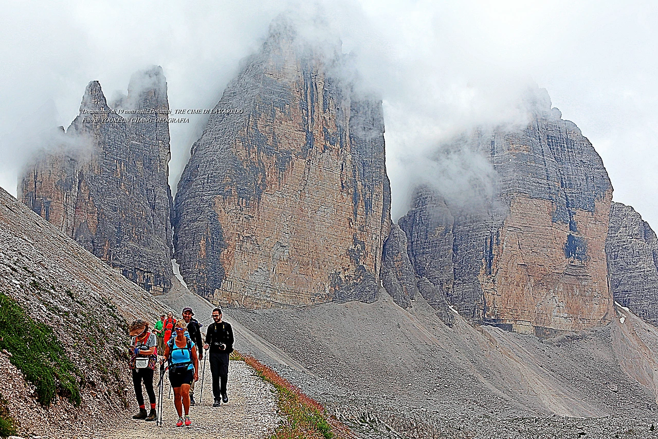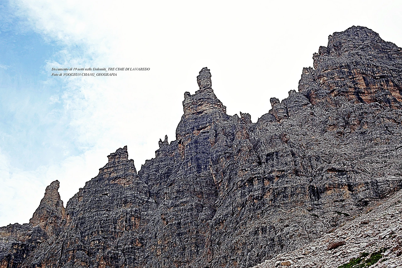 신작로를 따라 걸으며 풀꽃들과 대화를 나누며 조금씩 멀어지자, 마침내 베일에 싸였던 뜨레 치메 디 라바레도의 세 봉우리가 위용을 드러냈다. 엄청난 기운이 가슴속으로 파고든다. 세 봉우리는 좌로부터 치마 삐꼴라(Cima piccola, 2,857m), 치마 그란데(Cima grande, 2,999m) 및 치마 오베스트(Cima ovest, 2,973m)로 구성돼 있다. 각각 작은 봉우리, 큰 봉우리, 동쪽 봉우리로 부른다. 기록, 돌로미티(Dolomiti) 19박 20일은 계속 이어진다.