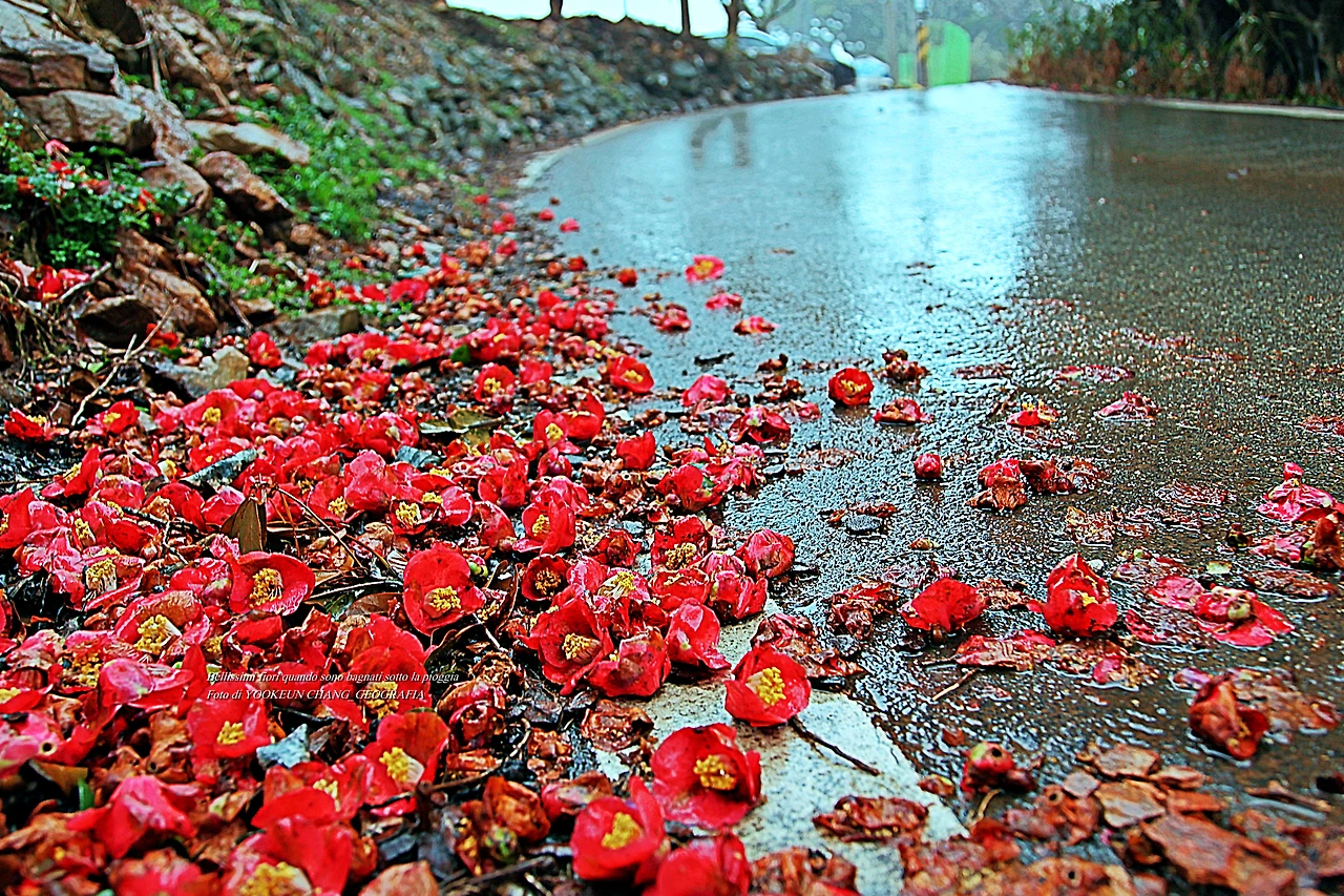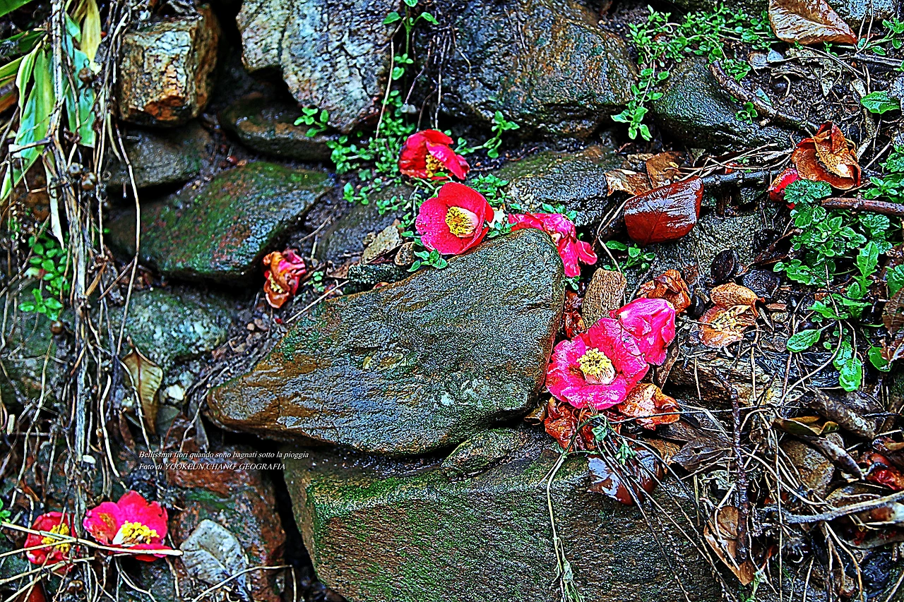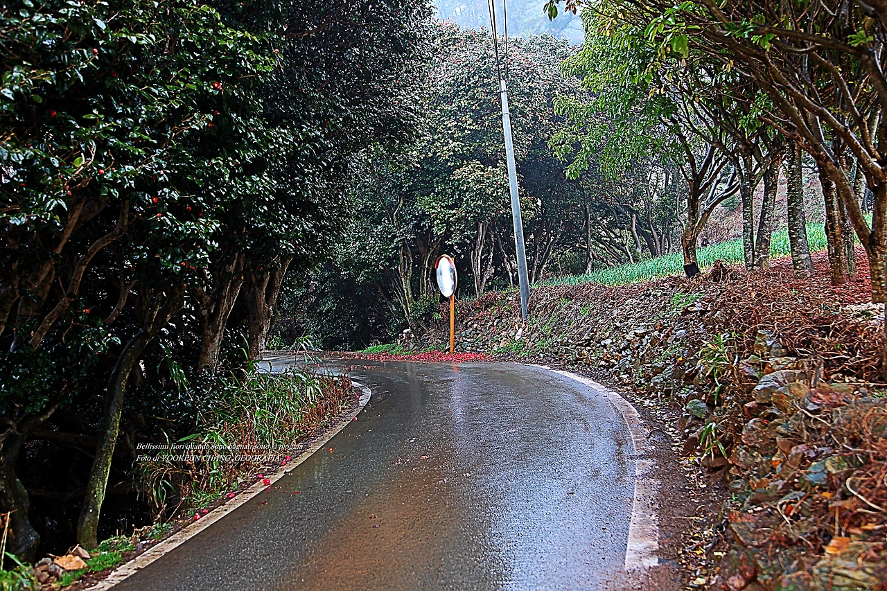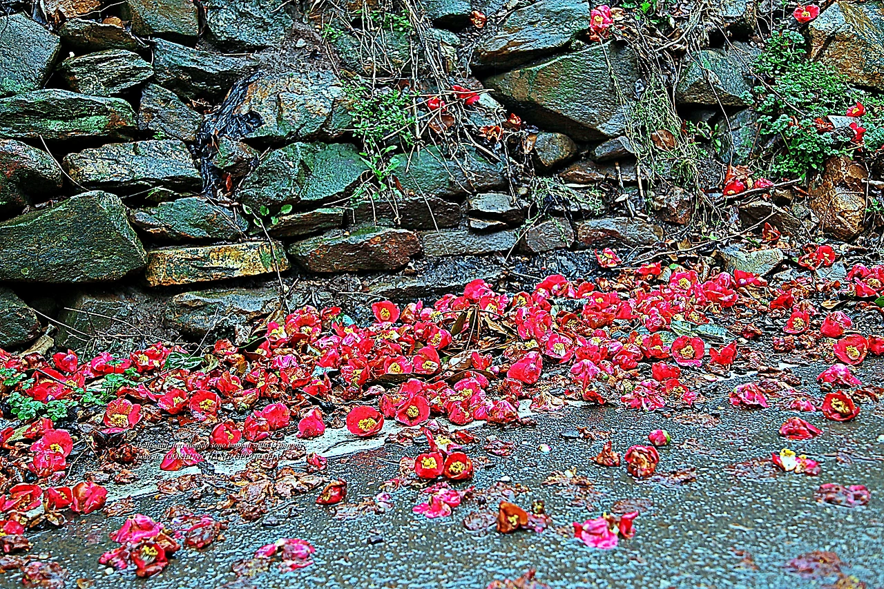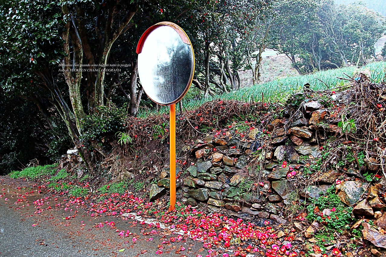 새빨간 선홍색의 동백꽃이 무리 지어 낙화된 곳은 돌로 만든 축대 앞이었으며 축대 너머로 마늘밭이 몇 채의 민가와 함께 비를 맞고 있었다. 생전 처음 보는 광경이 눈 앞에 펼쳐진 것이다. (세상에..!!)