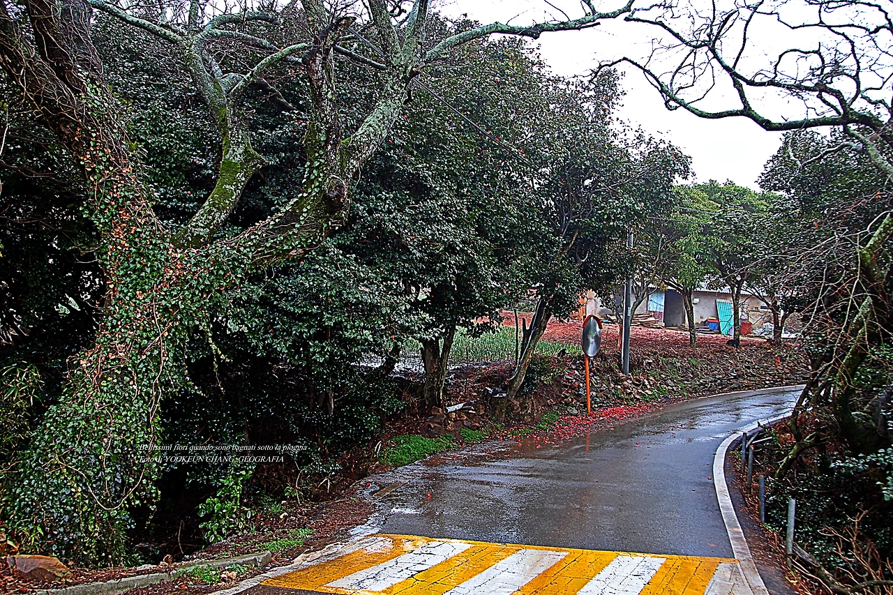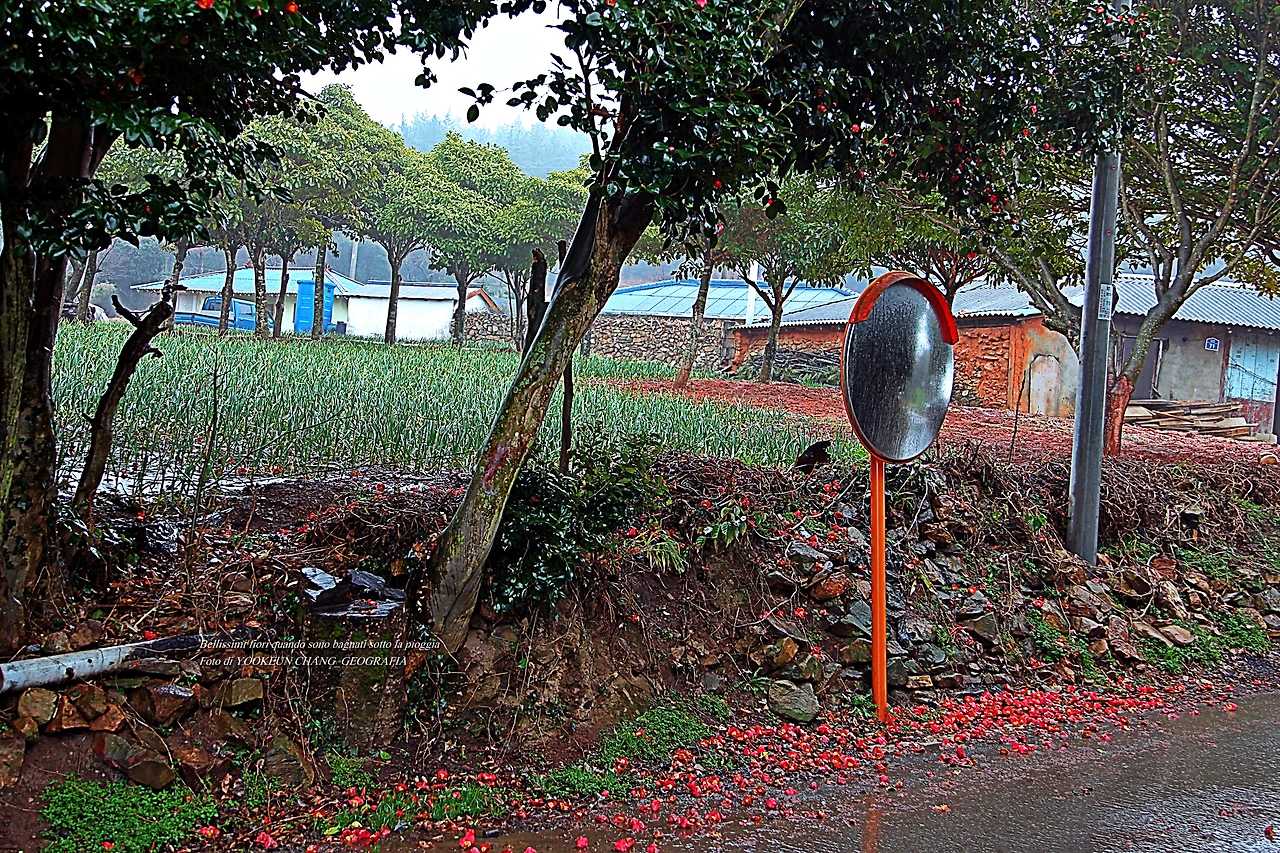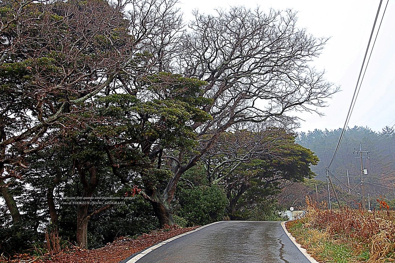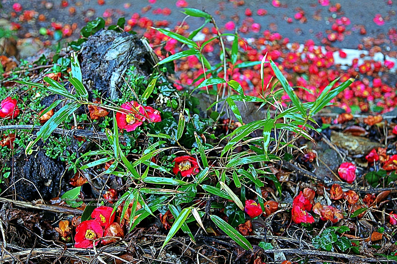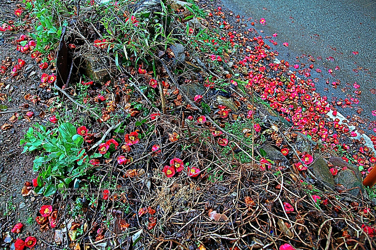 새빨간 선홍색의 동백꽃이 무리 지어 낙화된 곳은 돌로 만든 축대 앞이었으며 축대 너머로 마늘밭이 몇 채의 민가와 함께 비를 맞고 있었다. 생전 처음 보는 광경이 눈 앞에 펼쳐진 것이다. (세상에..!!)