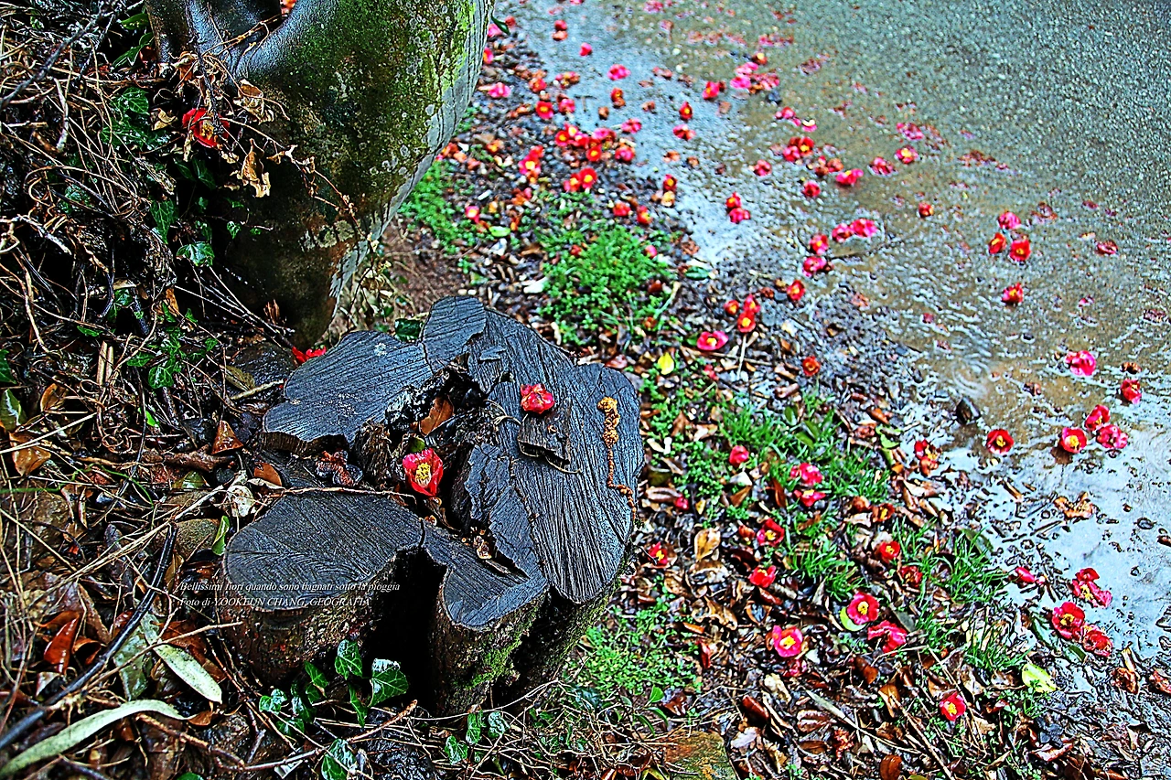 자동차가 멈추어 선 곳은 횡단보도 비러 앞. 팽나무 숲과 동백숲이 울창한 작은 도랑 너머로 선홍색 꽃잎이 자지라 졌다. 봄비가 부슬부슬 내리고 있었다. 땅은 촉촉이 젖었고 나무 이파리들도 비에 젖어 반들반들하다. 차를 도로 가장자리에 주차해 놓고 낙화 현장으로 다가가 보았다.
