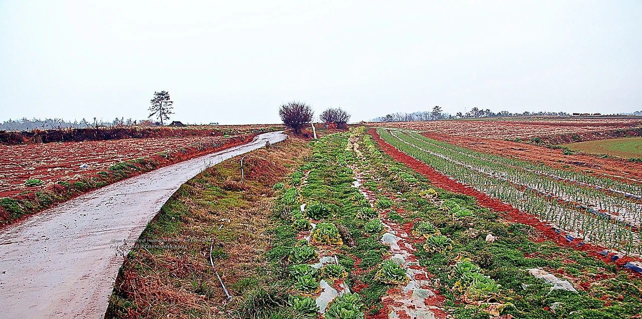가을걷이가 끝난 황토밭에는 미처 자라지 못한 봄동 배추가 주인 몰래 한아름 크기로 자라난 곳이다. ㅁ엇 보다 눈길을 끈 것은 붉은 황토였다. 황토와 봄비를 맞은 초록빛 보리밭이 환상의 풍경을 자아내는 것이다. 또 그 곁으로 가을걷이가 끝난 배추밭에는 배추가 겉옷을 함부로 벗어던진 모습이 연출되고 있었다. 속 알맹이들은 다 어디로 갔는지 비에 젖고 있었다.
