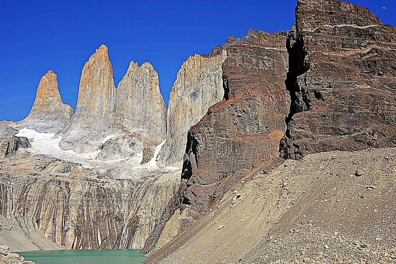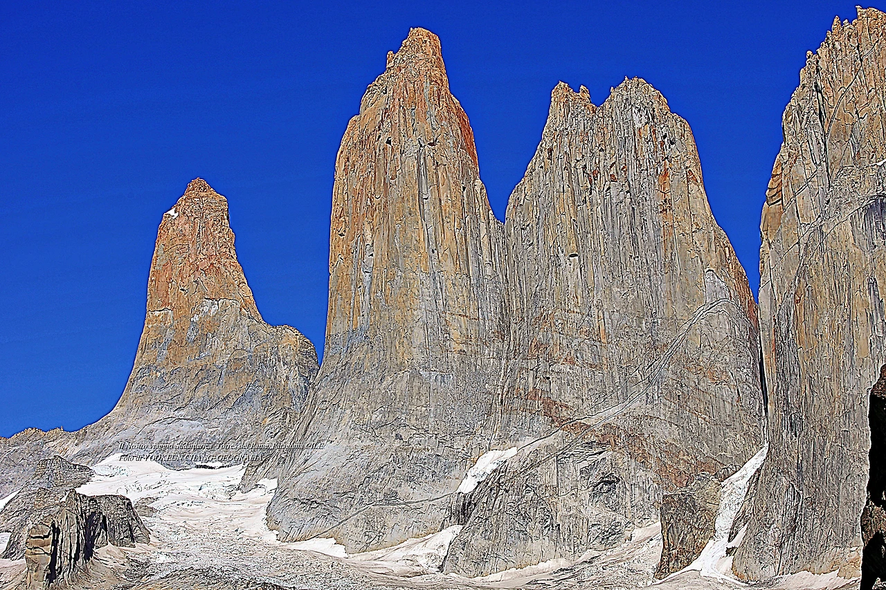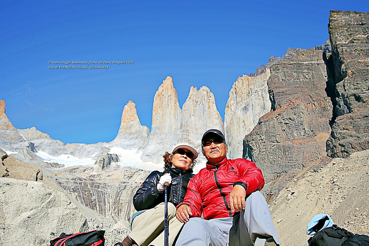 두 사람이 넋 놓고 바라보고 있는 시선 끄트머리에 무엇이 있길래 저러고 있을까.. 하니와 나 또한 이들의 모습을 쏙 빼닮았다. 유구무언(有口無言).. 이곳 또레스 델 빠이네 정상에 서면 할 말을 잊게 되는 것이다. 바람을 피해 적당한 장소를 잡고 난 다음 입을 굳게 다문채 바라보는 곳은 조물주가 파타고니아에 남긴 걸작품이다.