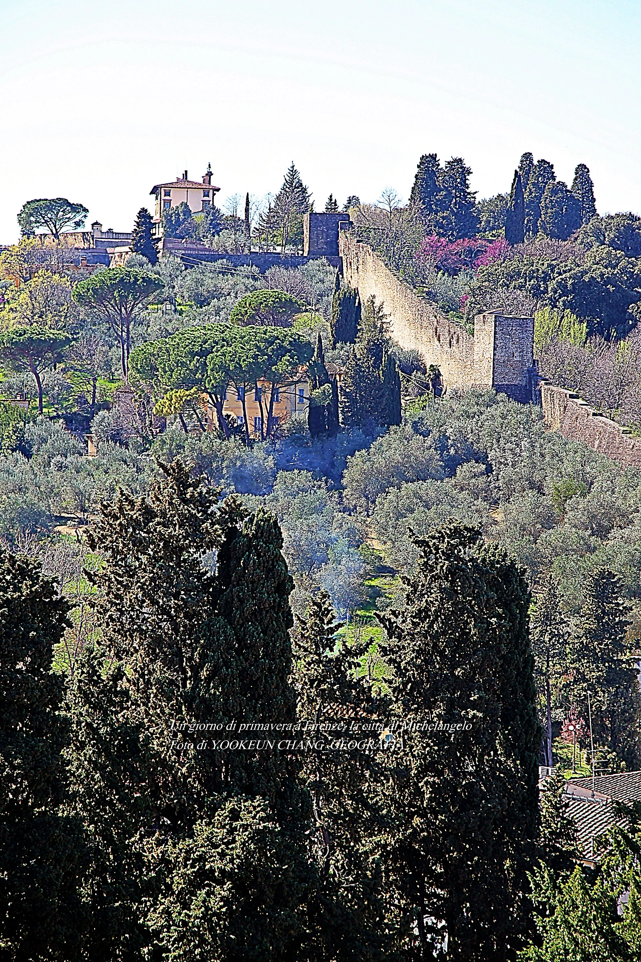 서기 2021년 3월 27일 오후(현지시각), 사진첩을 열어 다시 미켈란젤로의 도시 피렌체의 어느 봄날을 찾아가고 있다. 위 자료사진의 위치는 피렌체서 내가 제일 좋아하는 풍경 중 하나이다. 미켈란젤로 광장(Piazzale Michelangelo) 바로 아래에 위치한 장미들의 정원(Giardino delle Rose)과 광장에서 바라보면, 저 멀리 우측으로 피렌체 성곽(Mura di Firenze)이 보인다.