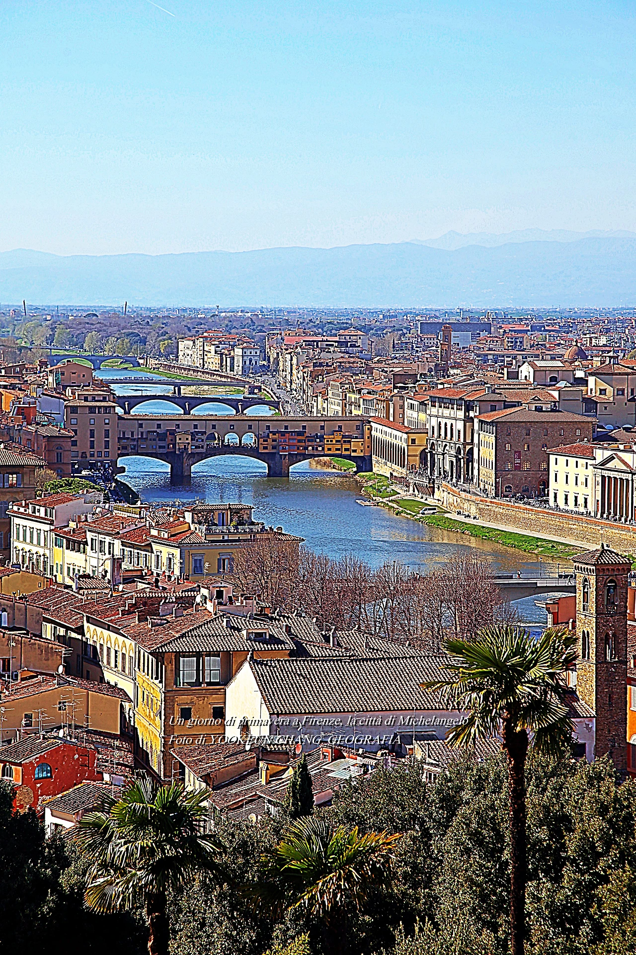 그리고 시선을 아르노 강(Fiume Arno) 쪽으로 돌리면 그 유명한 뽄떼 베끼오(Ponte vecchio)로부터 뽄떼 산타 트리니따(Ponte Santa Trinita), 뽄떼 알라 까라이아(Ponte Alla Carraia) 등이 서쪽으로 나란히 이어지고 있는 것이다. 참 꿈같은 풍경이다. 그리고 시선은 피렌체 중심의 두오모(Cattedrale di Santa Maria del Fiore)와 지오또의 종탑(Campanile di Giotto) 등에 머물게 되는 것이다.