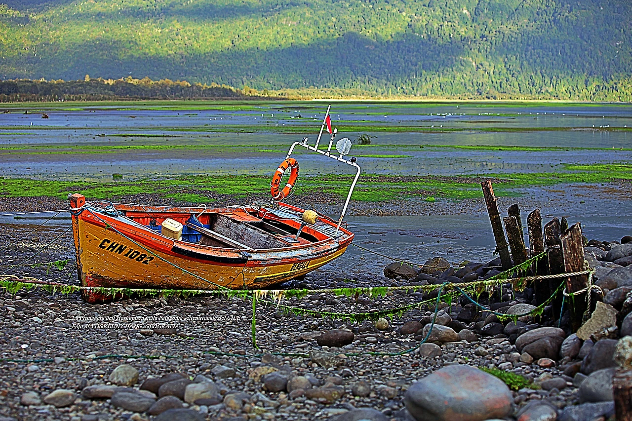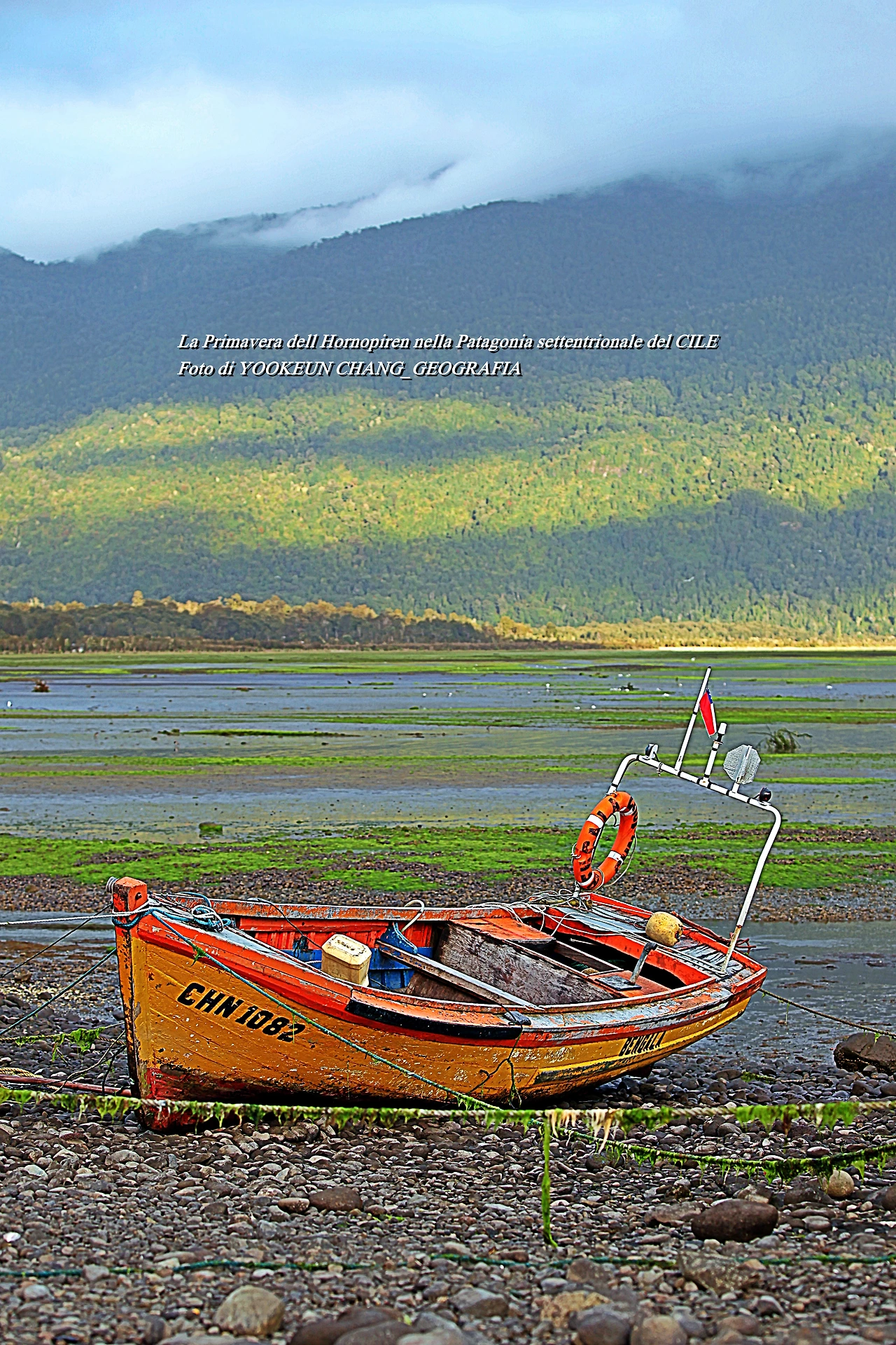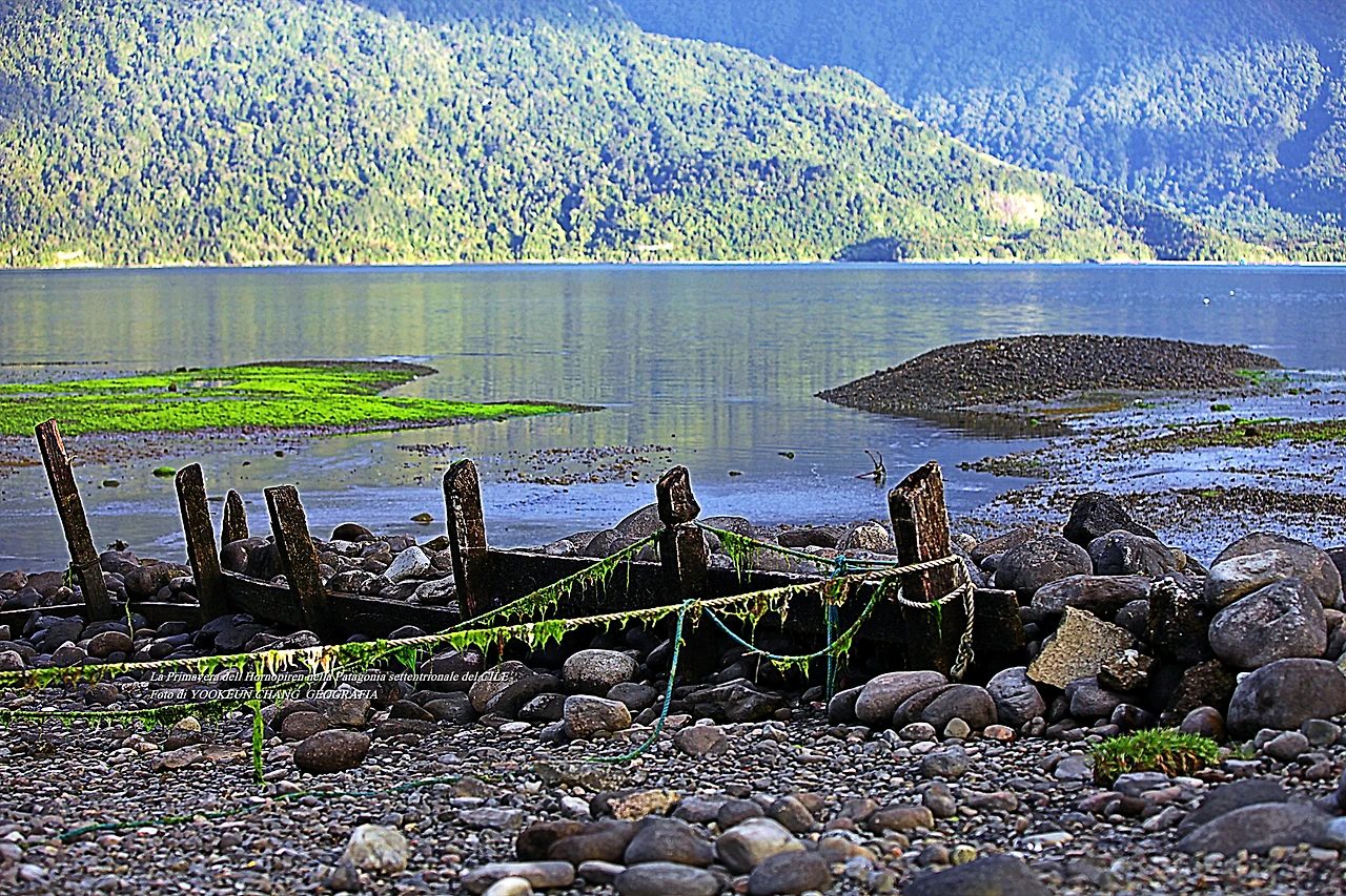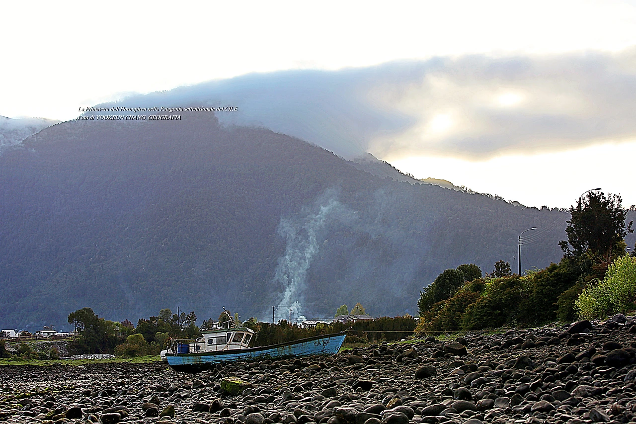 나는 낭만 덕구라 해. 선박 한 척이 뭍으로 올라온 듯한 바닷가.. 그 뒤로 연기가 모락모락 피어오르는 곳은 북부 파타고니아 오르노삐렌의 한쪽 모퉁이에 해당하는 곳이야. 나와 우리 친구들이 살고 있는 이곳에는 강이 세 군데나 있어. 제일 큰 강은 리오 블랑꼬(Rio blanco)라 부르고, 그다음 리오 네그로(Rio negro)라 부르며 마지막으로 리오 꾸낄데오(Rio cuchildeo) 강이 있어. 뭍에서 옆으로 드러누운 듯한 어선 뒤로 리오 꾸낄데오 강이 흐르고 있고 그 너머 마을에는 중남부 파타고니아로 이어지는 선착장과 가까운 곳이야 마을의 한쪽 모퉁이인 셈야. 이런 설명이 필요할 것 같았어.
