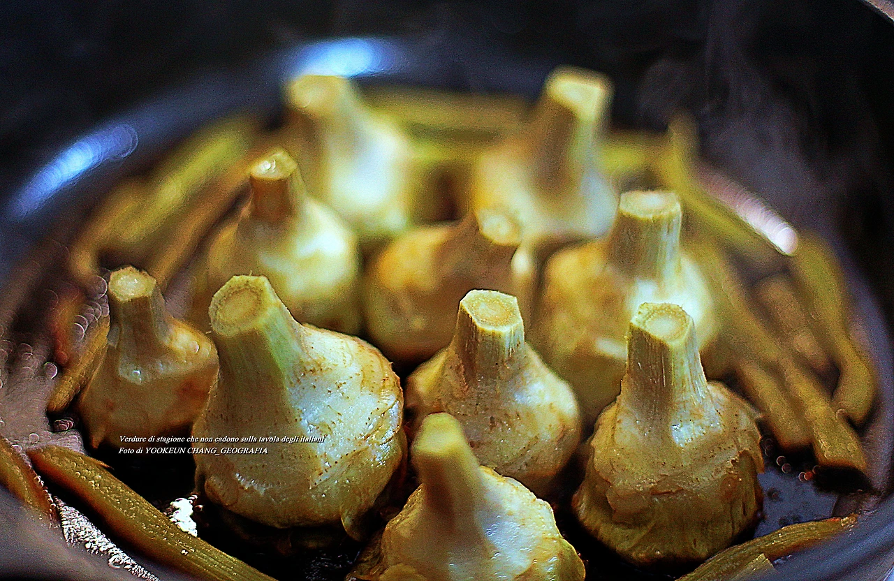 기다란 줄기를 적당히 자르고 가시 돋친 꽃잎을 제거한다. 그리고 줄기의 심 부분(이탈리아 사람들은 이것까지 '영혼, Anima'이라 부른다)만 남겨 놓고 잘 다듬는다. 갈변을 방지하기 위해서 지난번에는 식초를 사용했지만, 이번에는 주먹만 한 레몬(Limone) 한 개를 사용했다. 그리고 꽃봉오리를 거의 절반 가량 잘라버렸다.