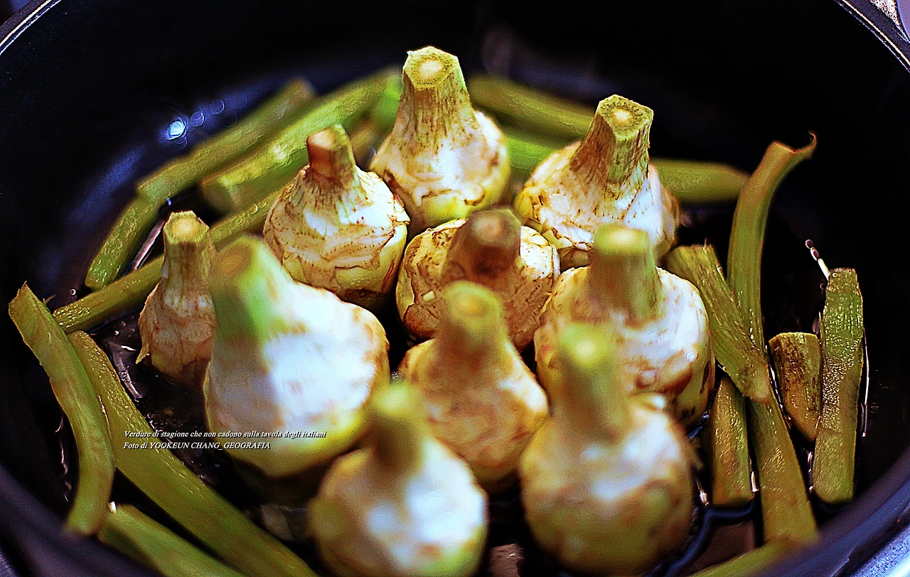 이번에는 아스파라거스(Asparago_Asparagus officinalis)를 갈아서 만든 즙과 까르치오피 줄기, 페페론치니, 치뽈라, 알리오를 잘게 다지고 질 좋은 깔라브리아산 올리브유와 조미간장으로 양념한 속을 사용했다. 이렇게 준비가 끝난 재료들은 냄비에서 올리브유로 쪄낸 까르치오피 요리(CARCIOFI IN PADELLA)로 탄생하는 것이다.