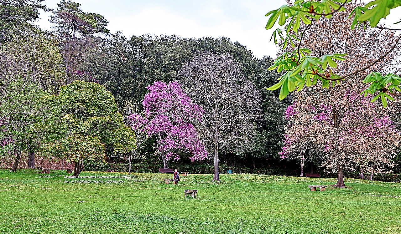 이곳에는 5헥타르에 달하는 관목과 숲이 있으며 연못과 잔디로 덮인 정원이 방문객을 편안하게 하는 곳이다. 특히 이맘때 유다 나무의 고목에서 내뿜은 붉디붉은 핏빛 꽃들은, 그야말로 환상적이어서 황홀경에 빠뜨리는 것이다. 어느 봄날, 하니와 나는 피에솔레로 목적지를 정하고 피렌체 시내 중심에서 천천히 걷다가 우연한 기회에 빌라 일 벤딸리오를 발견하게 된 것이다.
