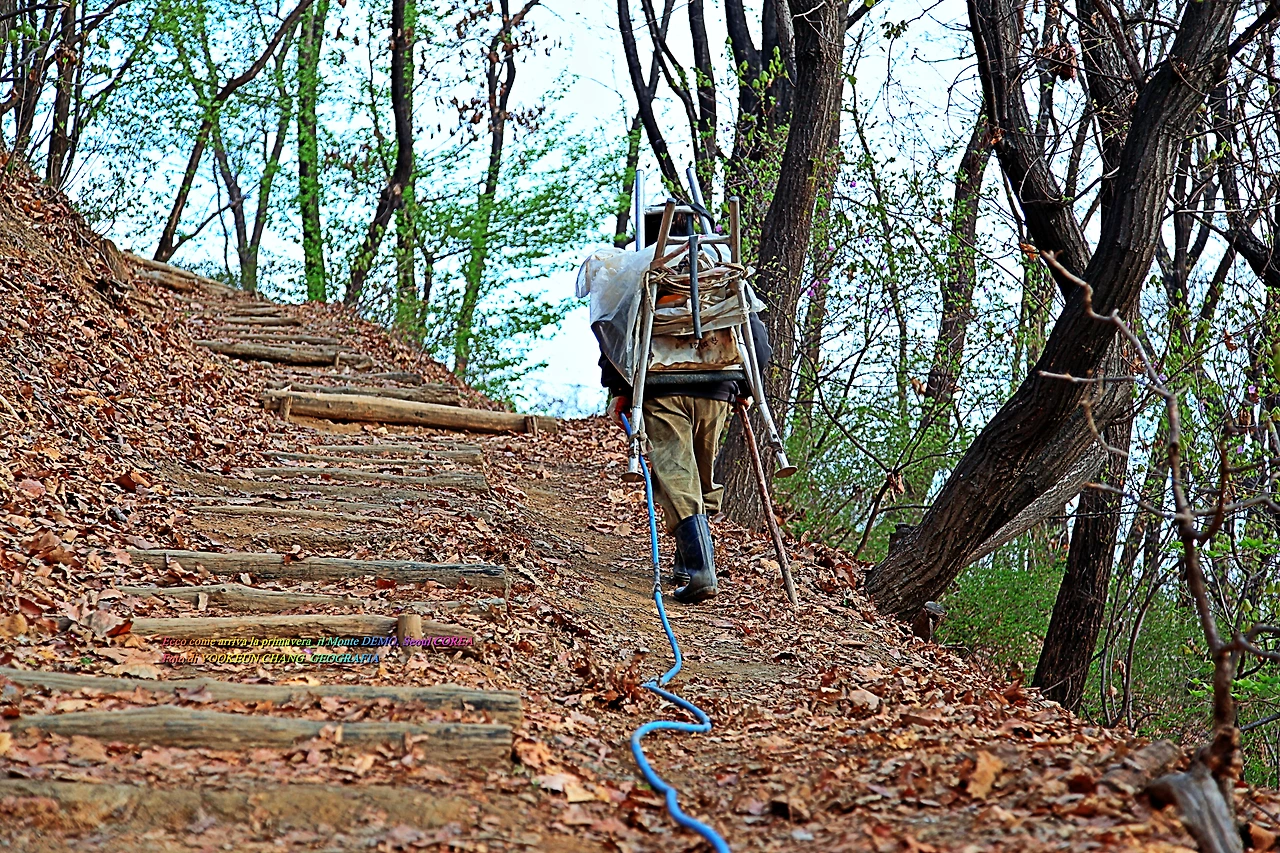 지게를 지고 파랗고 기다란 호스를 끌고 가는 장면은 밭에 물을 주기 위함이다. 당신의 아내는 산길에 노점을 열어 놓고 쪼그리고 앉아 손님을 기다리고 있다. 그곳으로 이어지는 산길에는 조팝나무며 산벚이 흐드러지게 피어있고 숲에는 봄의 요정들이 막 기지개를 켜고 눈부신 표정으로 아침을 맞이하는 것이다.