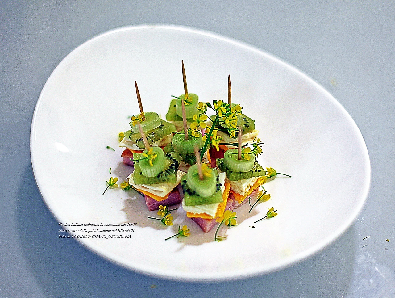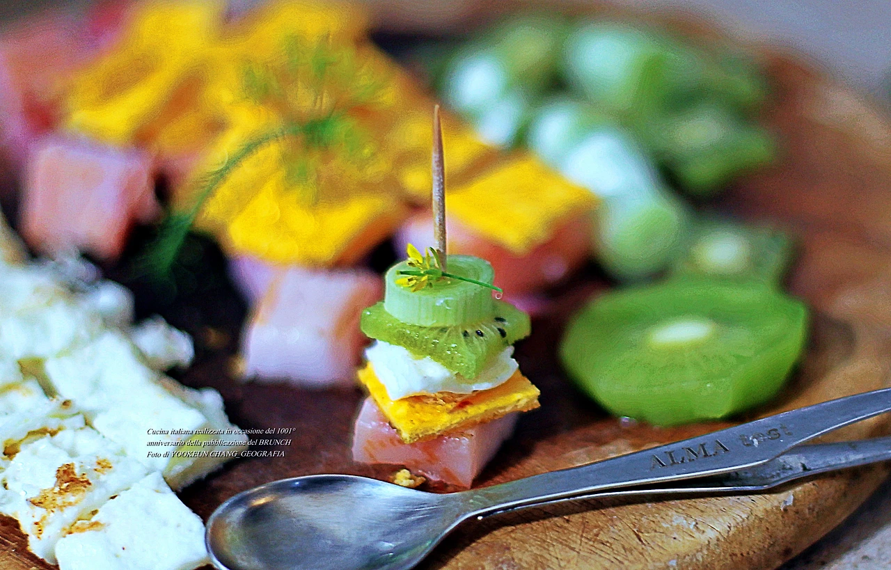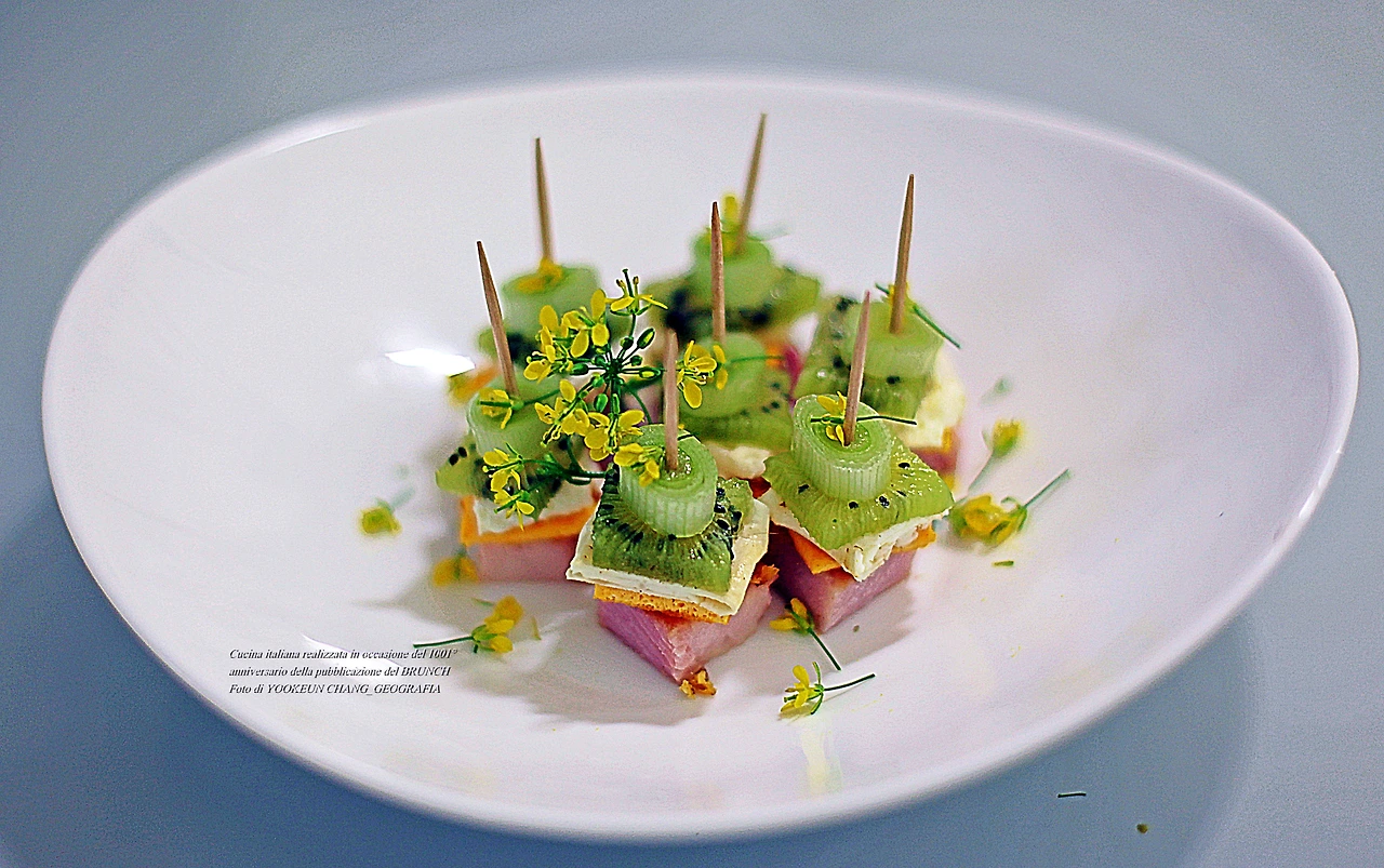식재료는 모두 7가지라고 말했다. 쁘로슈또 꼬또(Prosciuto cotto, 익힌 쁘로슈또) 그 위로 계란 노른자와 흰자로 만든 지단 조각, 그다음 키위와 딸기와 대파 조각과 치메 디 라파(Cime di rapa)의 앙증맞은 꽃이 차례대로 층층이 쌓여있는 모습이다. 각각의 식재료들의 맛을 상상해 보시면 한 입 크기의 꼬꼬마 요리의 맛을 알게 된다.
