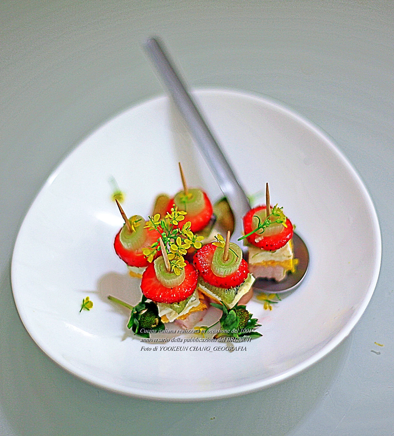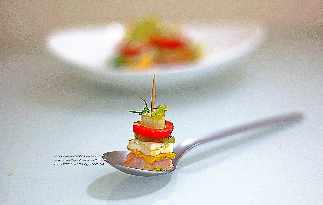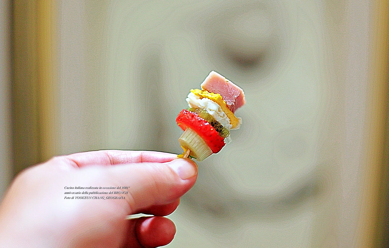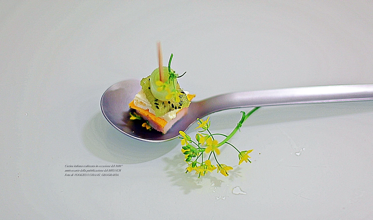 브런치를 열자마자 등장하는 숟가락 위의 꼬치로 고정한 층층이 얹힌 음식.. 꼬치의 정체는 이쑤시개이며 식재료는 모두 7가지이다. 맨 아래 쁘로슈또 꼬또, 그 위로 계란 노른자와 흰자로 만든 지단 조각, 그다음 키위와 딸기와 대파 조각과 치메 디 라파의 앙증맞은 꽃이 차례대로 층층이 쌓여있는 모습이다. 딱 한 입 크기의 이 음식을 아뮈즈 부슈(Amuse-bouche)라 부르며, 이탈리아 요리에서 식전주(食前酒)에 함께 나가는 음식이다. 식전주는 이탈리아어로 아뻬르띠보(Aperitivo)라 부른다.