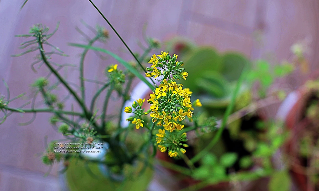 두 주 전에 구입한 치메 디 라파(Cime di rapa) 꽃봉오리를 따로 떼내어 팻트병에 끼워두었더니 앙증맞은 꽃을 내 놓았다.