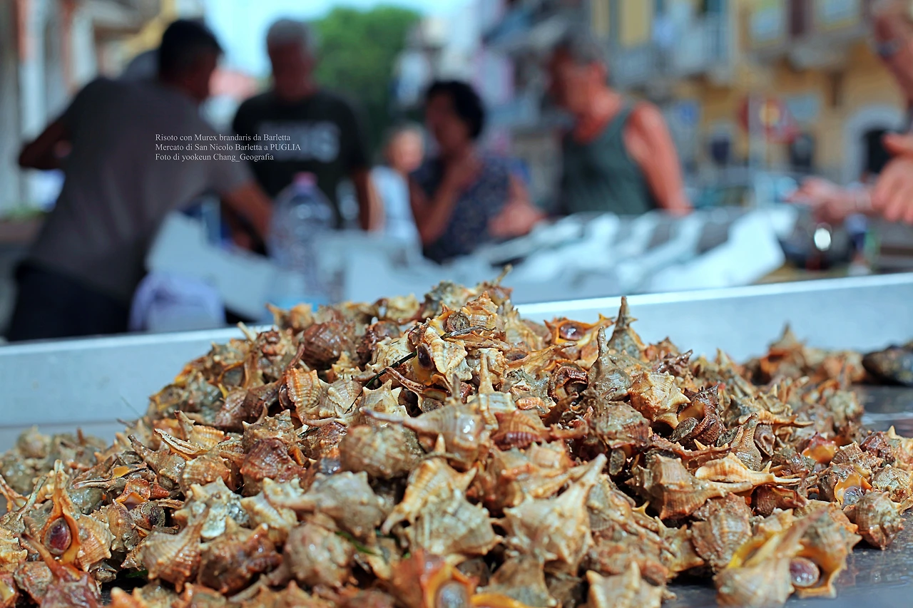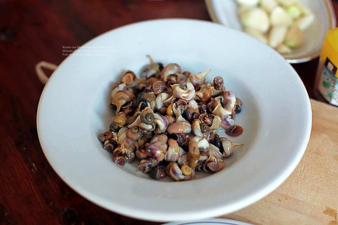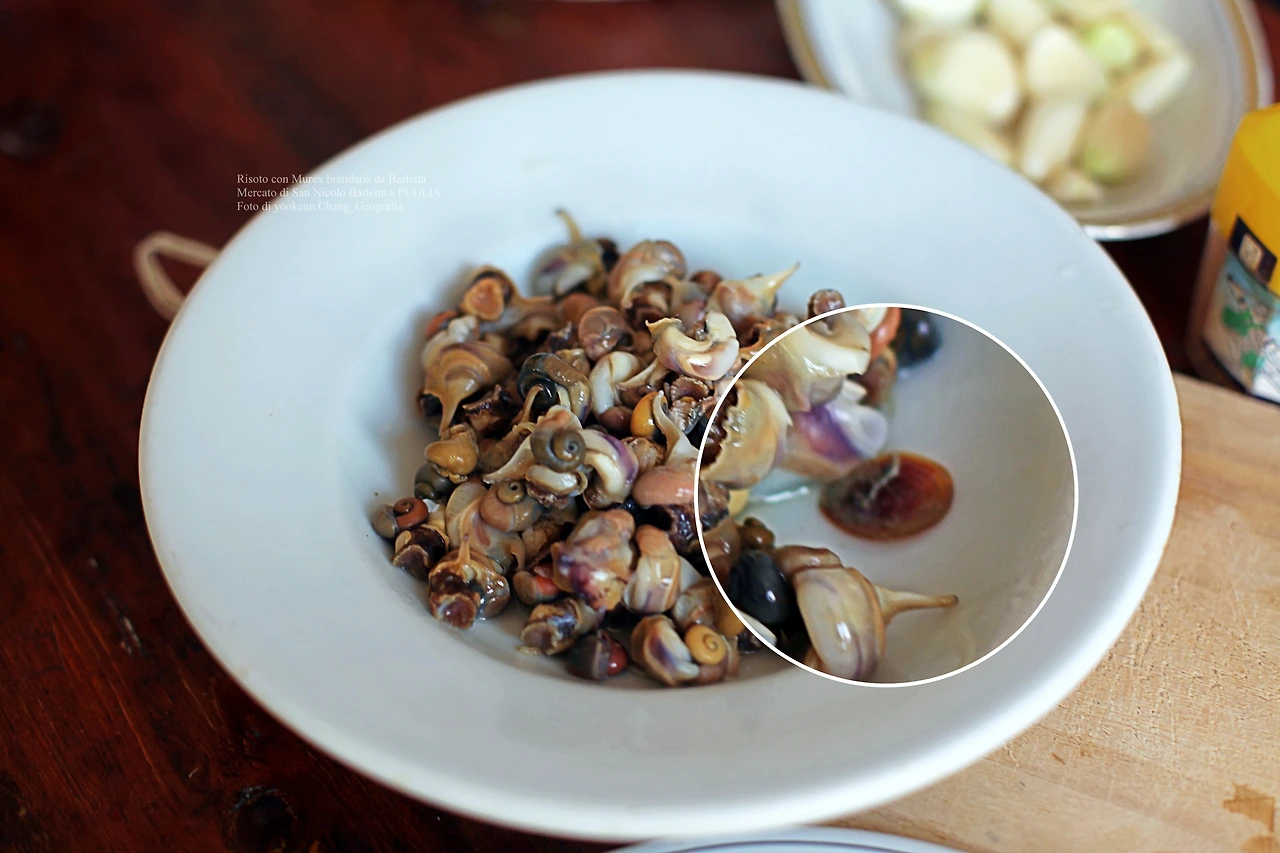 기회는 생각보다 빨리 찾아왔다. 바를레타 재래시장으로 가는 입구의 작은 어물전에서 눈에 띄는 식재료를 만난 것. 녀석은 우리에게 낯익은 뿔고둥(Murex brandaris)이었다. 가격을 물어보니 1킬로그램에 2유로였다. 녀석을 보는 순간 내 머릿속에서는 가장 적합한 요리를 생각하고 있었다. 리소토(il Risotto)였다. 우리나라에서 먹던 고둥 맛에 다슬기 국물을 연상하며 녀석을 쁘란쪼(Il pranzo)에 내놓을 작정이었다. 대체로 현지인들은 고둥을 별로 반기지 않아서 어물전에 남아있던 뿔고둥 다수가 장바구니에 든 것이다. 그리고 재래시장에서 만난 과일과 야채는 거의 공짜나 다름없는 가격이었다.(따로 포스팅..^^) 아울러 시장의 수산물들을 두루 살펴보니 나의 판단과 별로 다르지 않았다. 숙소로 돌아오자마자 녀석을 깨끗이 씻어 곧바로 손질로 들어갔다.