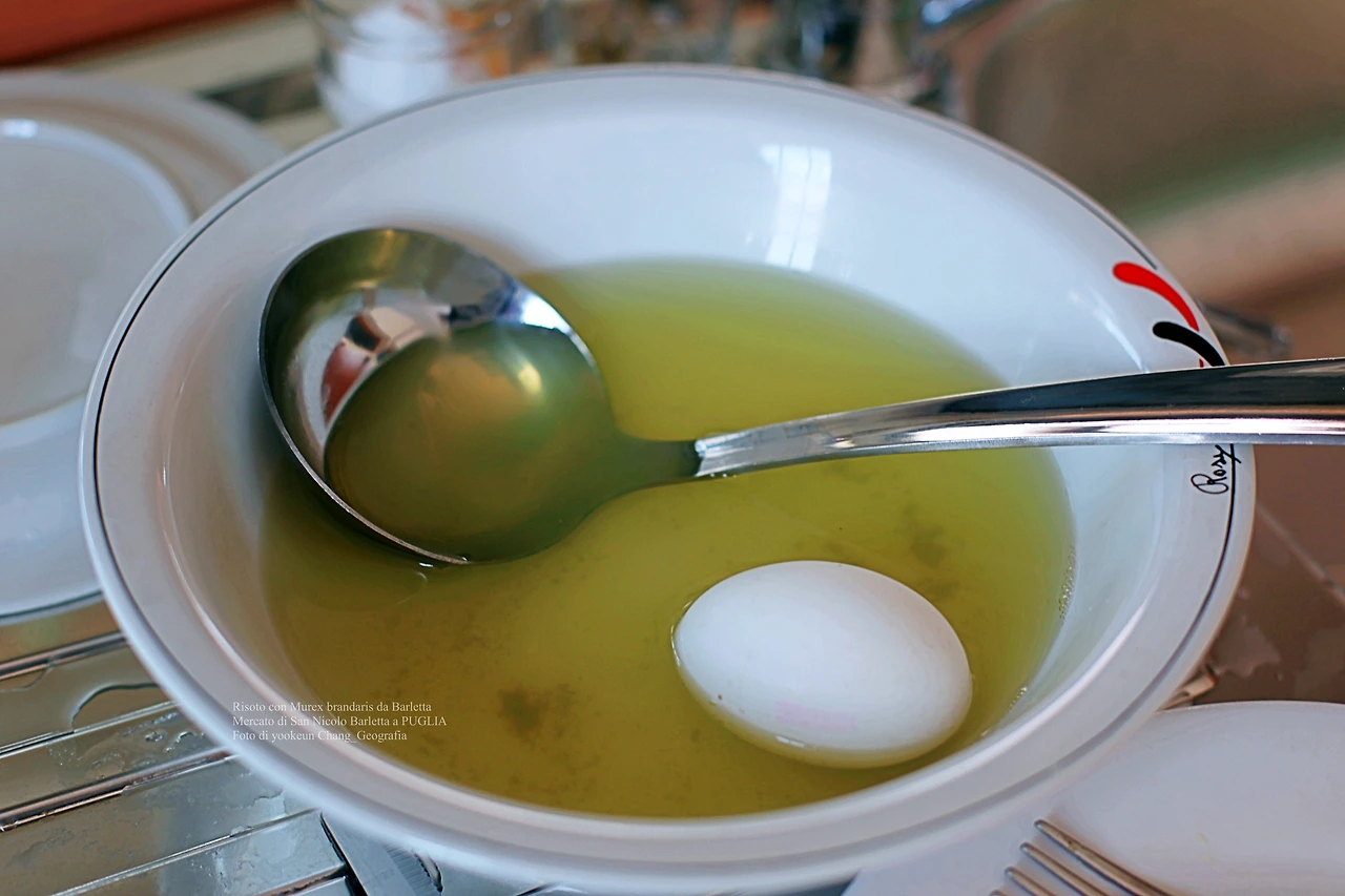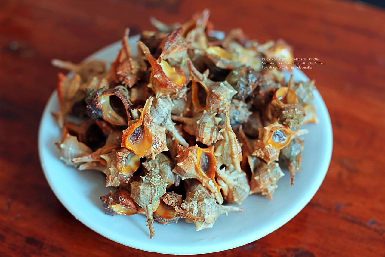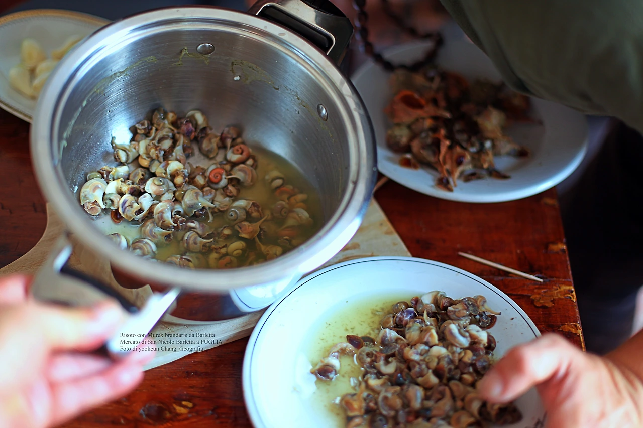 이런 이유 등으로 북부지방에서는 15세기부터 쌀이 생산되기 시작했고, 쌀을 이용한 각종 음식이 생겨나면서 리소토가 탄생한 것. 이후 리소토는 이탈리아 각 지방의 식재료를 응용한 오만가지 요리가 등장하게 된 것이다. 이를 테면 북부 해안 지방에는 생선이나 새우 조개 등을 응용한 요리가, 산악지방에서는 버섯이나 야채 육류 등을 이용한 리소토가 주재료로 사용되어 왔던 것. 떠라서 지금 글쓴이의 브런치에 소개되고 있는 리소토는 이탈리아 남부 지방 풀리아 주 바를레타에서 공급된 뿔고둥으로 만든 리소토(Risoto con Murex brandaris da Barletta)인 것.
