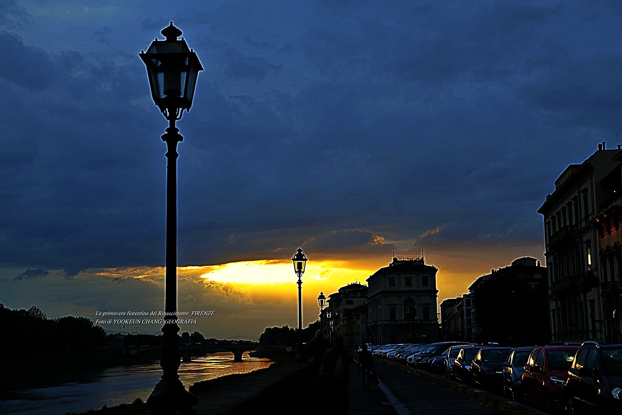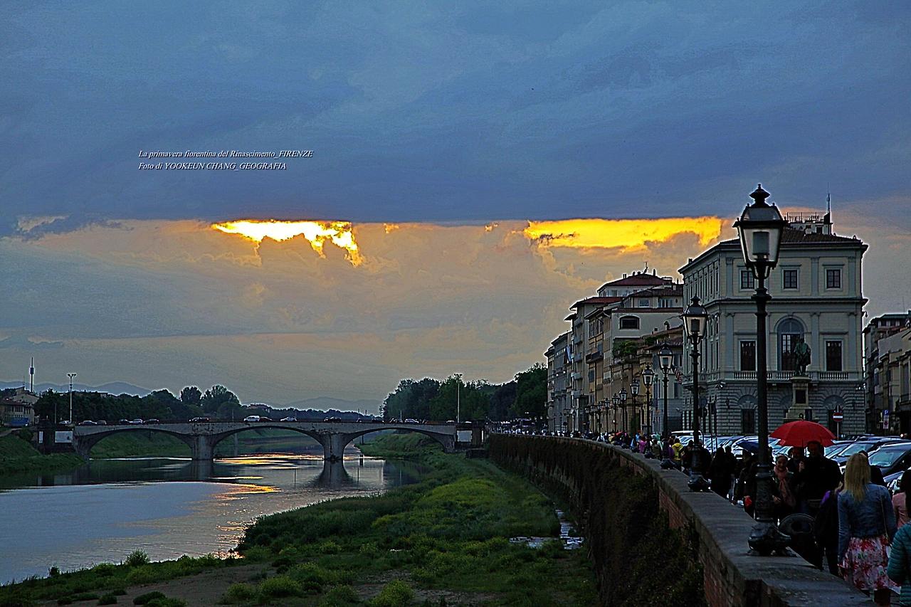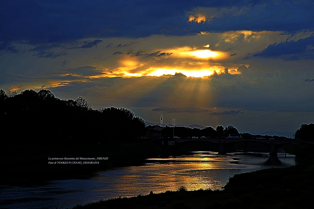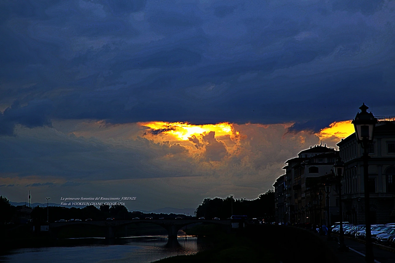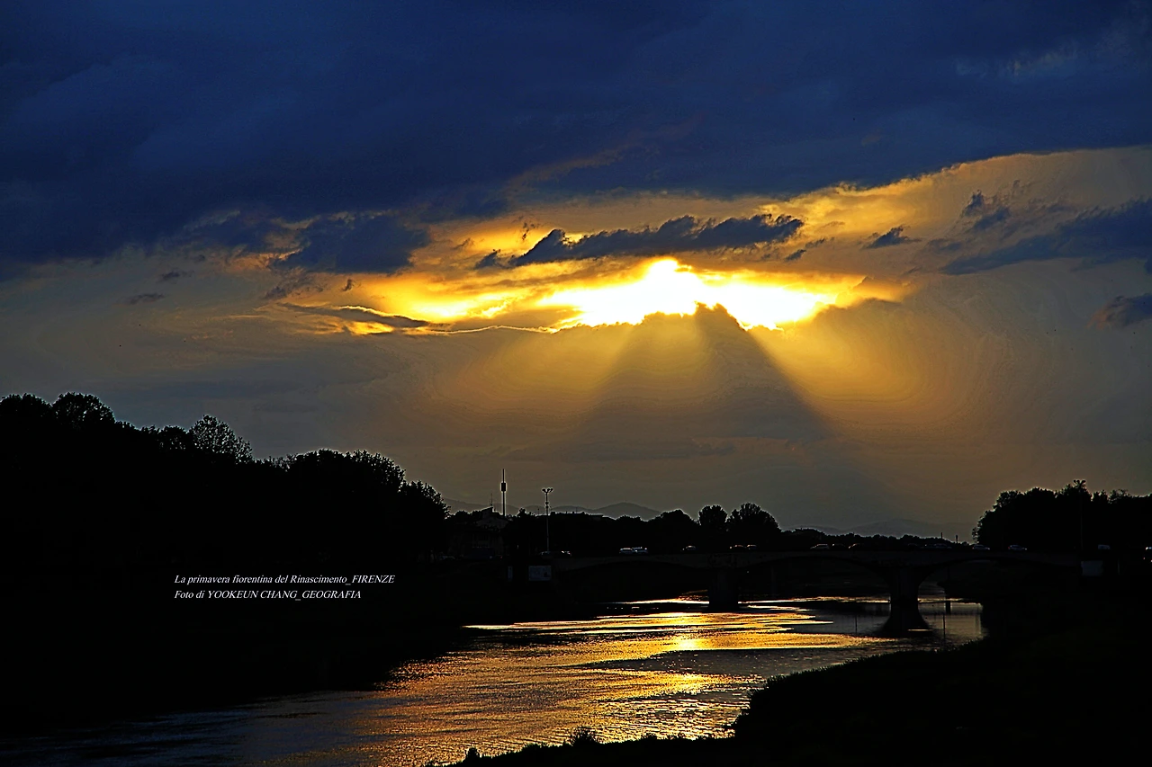 지금 보고 계신 장면들은 르네상스의 고도 피렌체를 휘감고 도는 아르노 강(Fiume Arno) 위로 쏟아지는 빛내림이다. 이날은 봄비가 오시던 저녁나절이었으므로 해넘이 대신 빛 내림 현상이 나타나 것이다. 아르노 강에 산책을 나갔다 만난 신비스러운 현상에 붙들려.. 빛 내림 현상이 끝날 때까지 아메리고 베스푸치 다리 곁에서 서성거린 것이다. (사진들은 비슷해 보이지만 전부 다른 장면들로 구성되어 있다. 차례대로 보시려면 아래 영상을 참조하시기 바란다.)