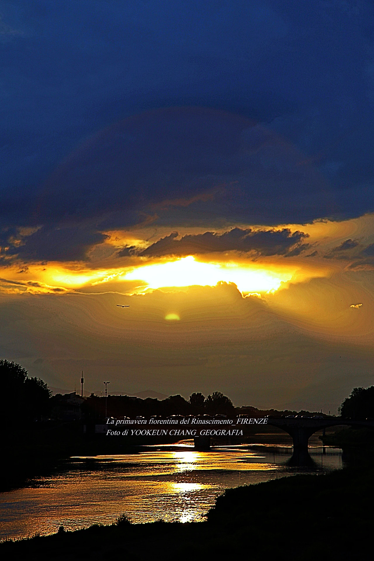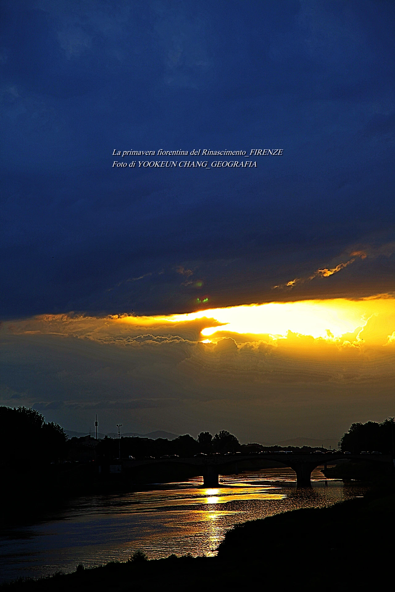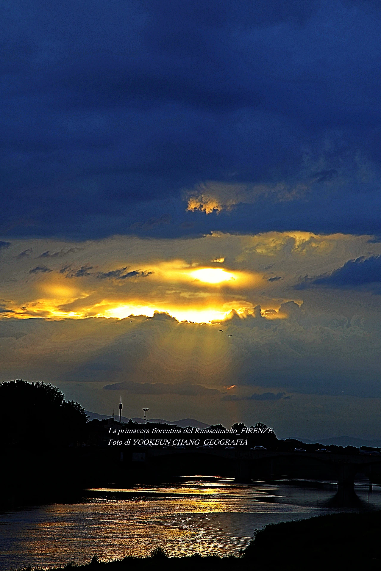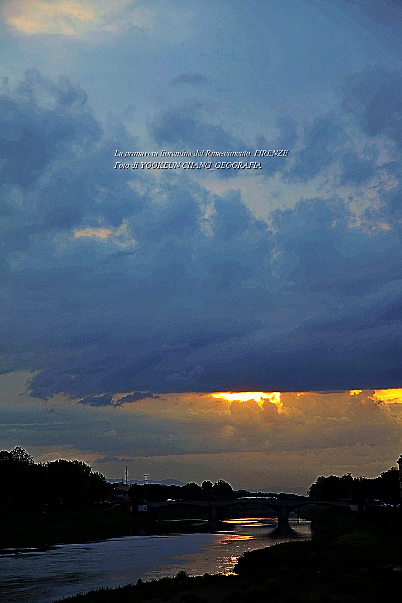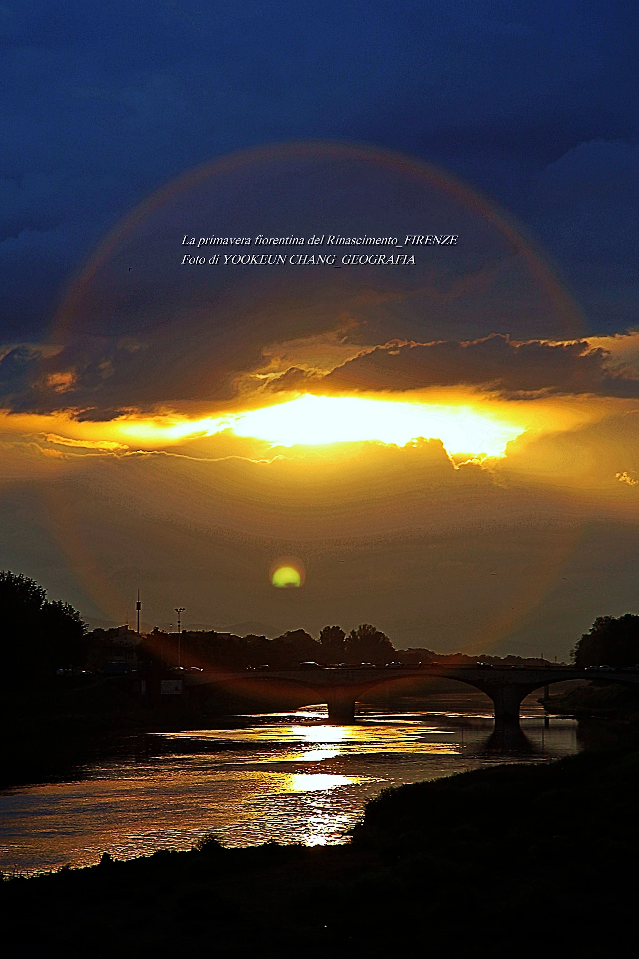 지금 보고 계신 장면들은 르네상스의 고도 피렌체를 휘감고 도는 아르노 강(Fiume Arno) 위로 쏟아지는 빛내림이다. 이날은 봄비가 오시던 저녁나절이었으므로 해넘이 대신 빛 내림 현상이 나타나 것이다. 아르노 강에 산책을 나갔다 만난 신비스러운 현상에 붙들려.. 빛 내림 현상이 끝날 때까지 아메리고 베스푸치 다리 곁에서 서성거린 것이다. (사진들은 비슷해 보이지만 전부 다른 장면들로 구성되어 있다. 차례대로 보시려면 아래 영상을 참조하시기 바란다.)