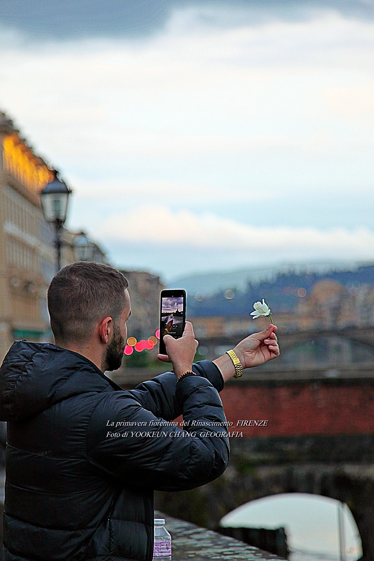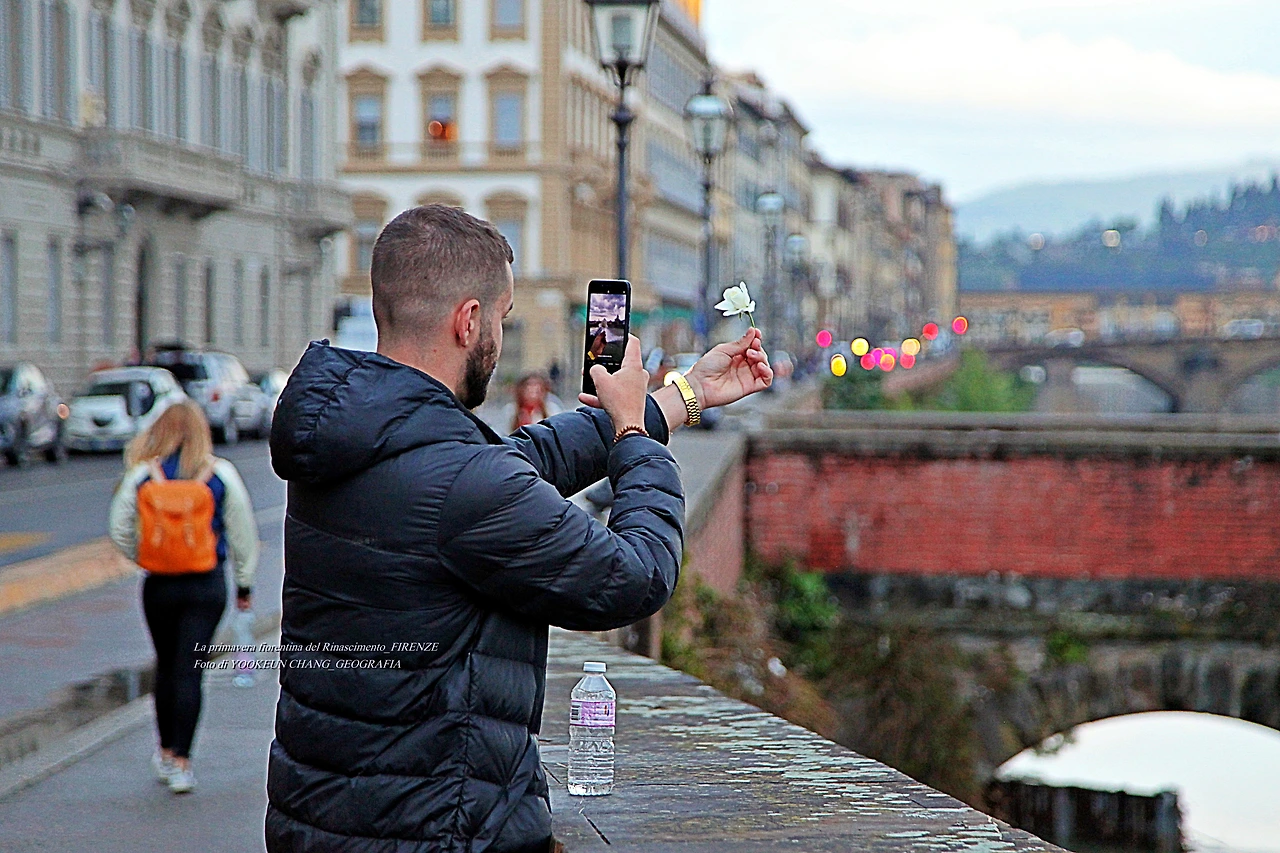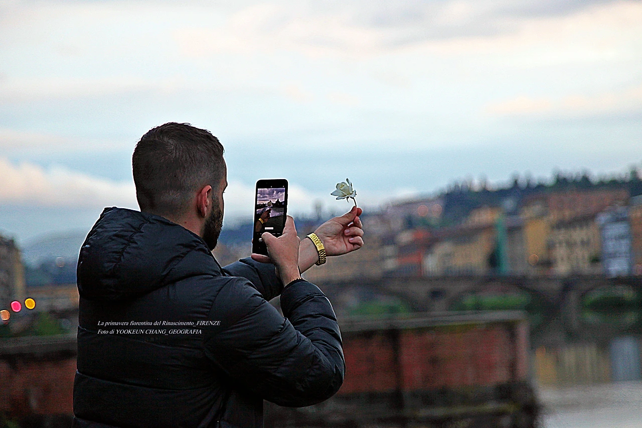 어느 봄날 아르노 강가에서 먹구름이 낀 하늘과 해넘이가 사라지는 풍경을 카메라에 담는데 끼어든 한 남자 사람.. 그의 용모로 미루어 아직 미혼자이거나 사랑에 빠진 콩깍지 씐 남자가 틀림없었다. 그는 어디서 꺾어왔는지 하얀 꽃 한 송이를 들고 산타 뜨리니따 다리 쪽을 배경으로 사진을 찍고 있는 것이다. 부득이한 사정으로 그의 애인과 함께 피렌체에 오지 못했던지.. 그는 한 여인에게 당신의 마음을 담은 사진을 찍고 있는 것이다.