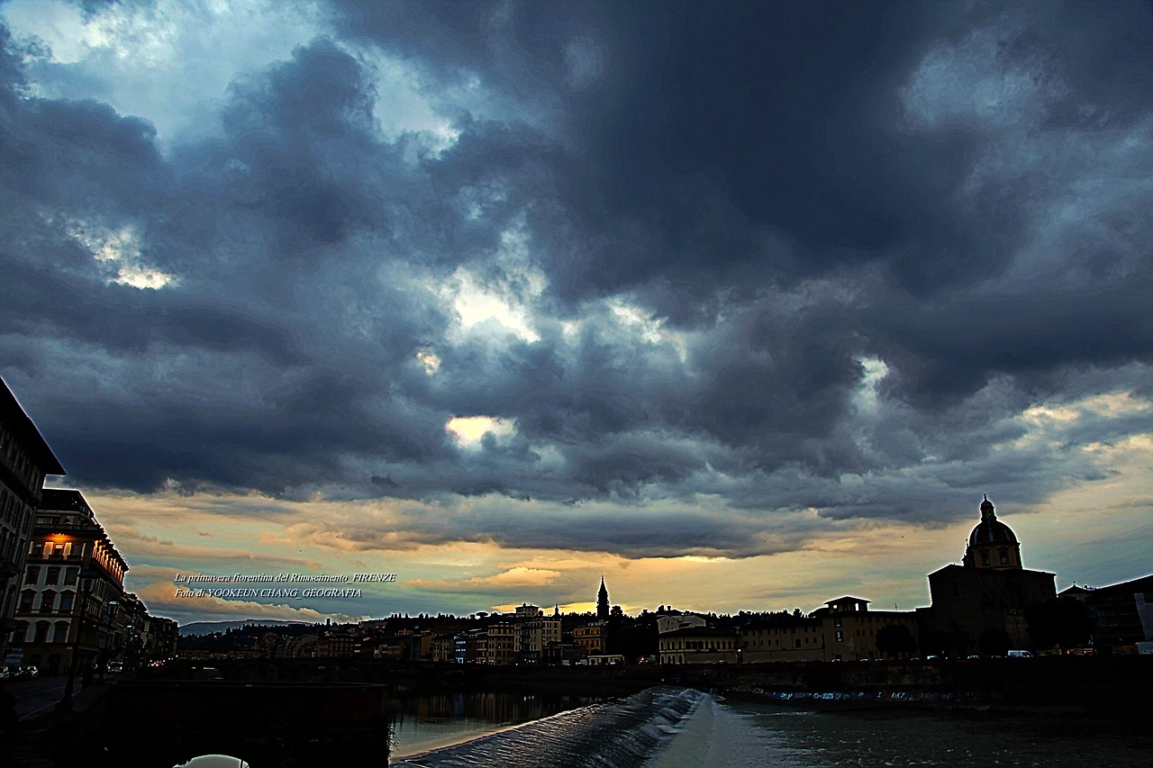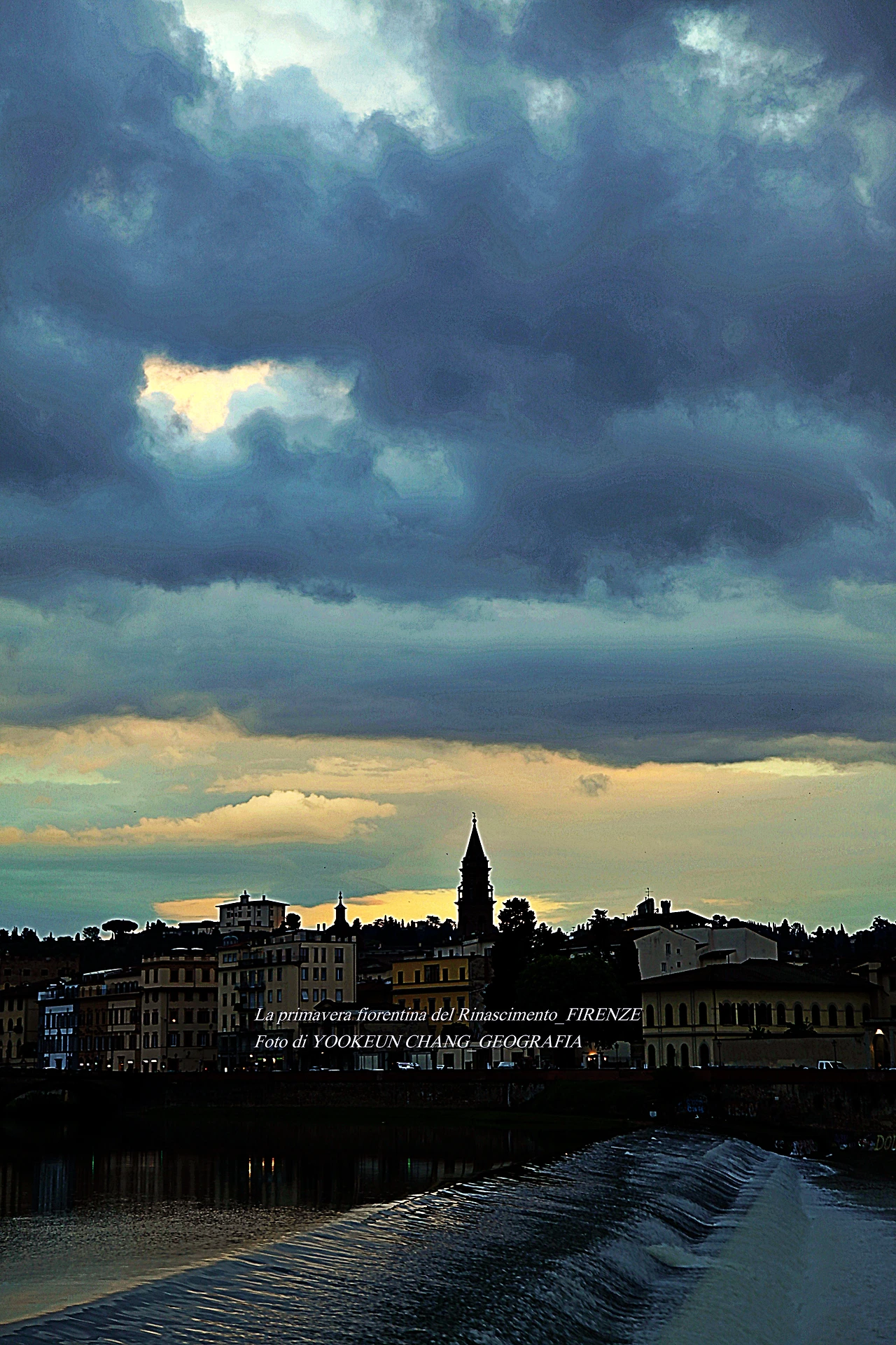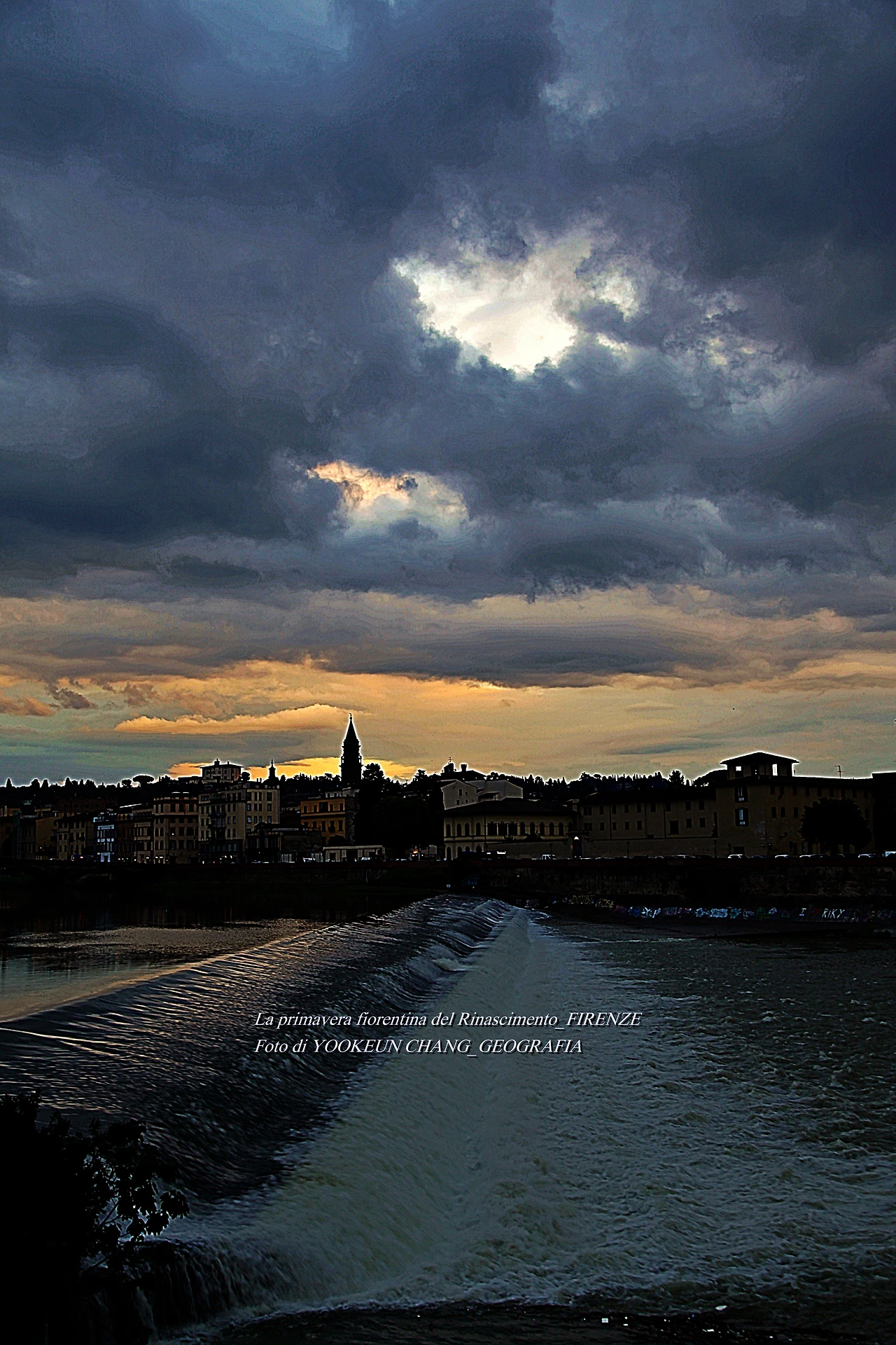 먹구름과 노을이 기막힌 조합을 이루고 있는 이곳은 르네상스의 고도 피렌체 아르노 강변(Fiume Arno)이다. 해 질 녘에 강가에 나와 해넘이 사진을 찍고 있는 것이다. 정확한 장소는 피렌체 출신 탐험가의 이름을 딴 뽄떼 아메리고 베스푸치(Ponte Amerigo Vespucci) 다리 앞이다.
