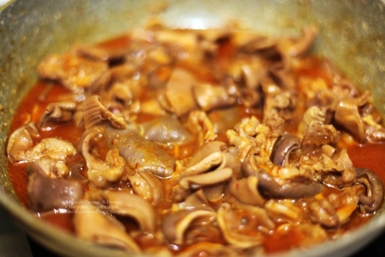 글쓴이가 이탈리아 요리에 매료된 건 몇 안 되는 양념으로 식재료 본연의 맛을 살려내는 것은 물론 다양한 슬로푸드 때문이었다. 마치 소 내장 부산물을 소금과 참기름에 찍어먹는 것과 별로 다르지 않다. 만약 그 내용물에 오만가지 약재를 넣고 양념을 범벅하면 식재료 본연의 맛이 나겠는가. 이번에 소개되는 소 내장 와인 조림은 글쓴이가 토스카나 주 키안티(Chianti)에서 먹어본 소고기 와인 조림을 응용한 리체타이다.