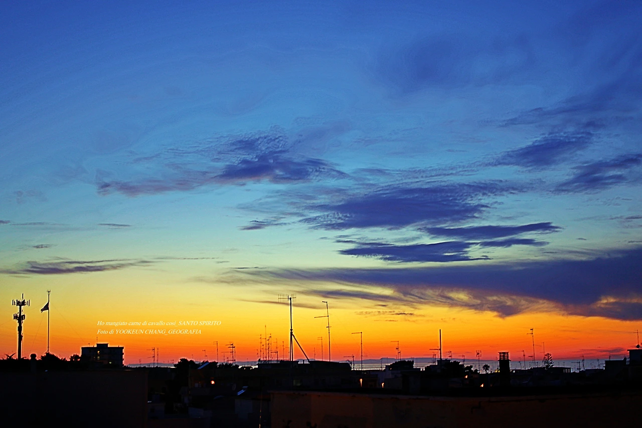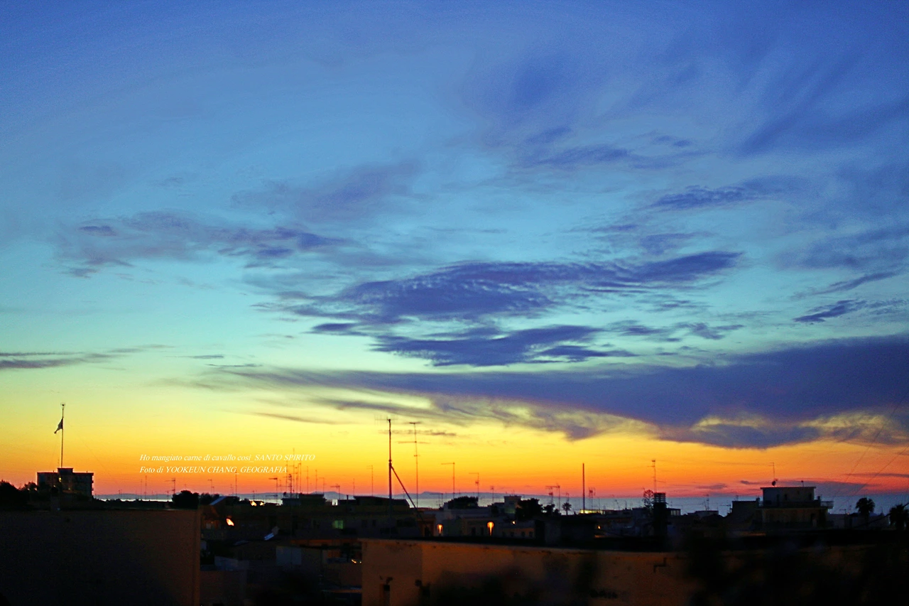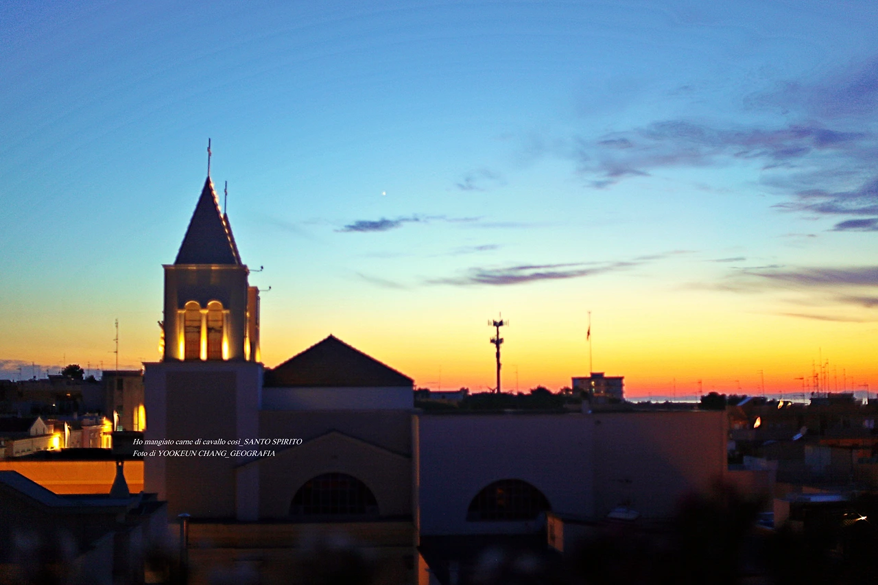 그리고 또 하나.. 니꼴라의 쾌활한 성격이 좌중을 압도했다. 아내의 부재에도 불구하고 손님을 초대해 놓고 당신은 물론 사람들을 행복하게 만드는 것이다. 처음 방문하는 집이 전혀 낯설지가 않었다. 니꼴라의 배려 때문이었다. 나는 그동안 옥상과 발코니를 오가며 아드리아해의 해넘이에 빠져들곤 했다. 그리고 이곳 뿔리아 주에서 가끔씩 먹게 된 말고기가 뷔노 로사또(Vino rosato)를 마구 당기게 만들었다.