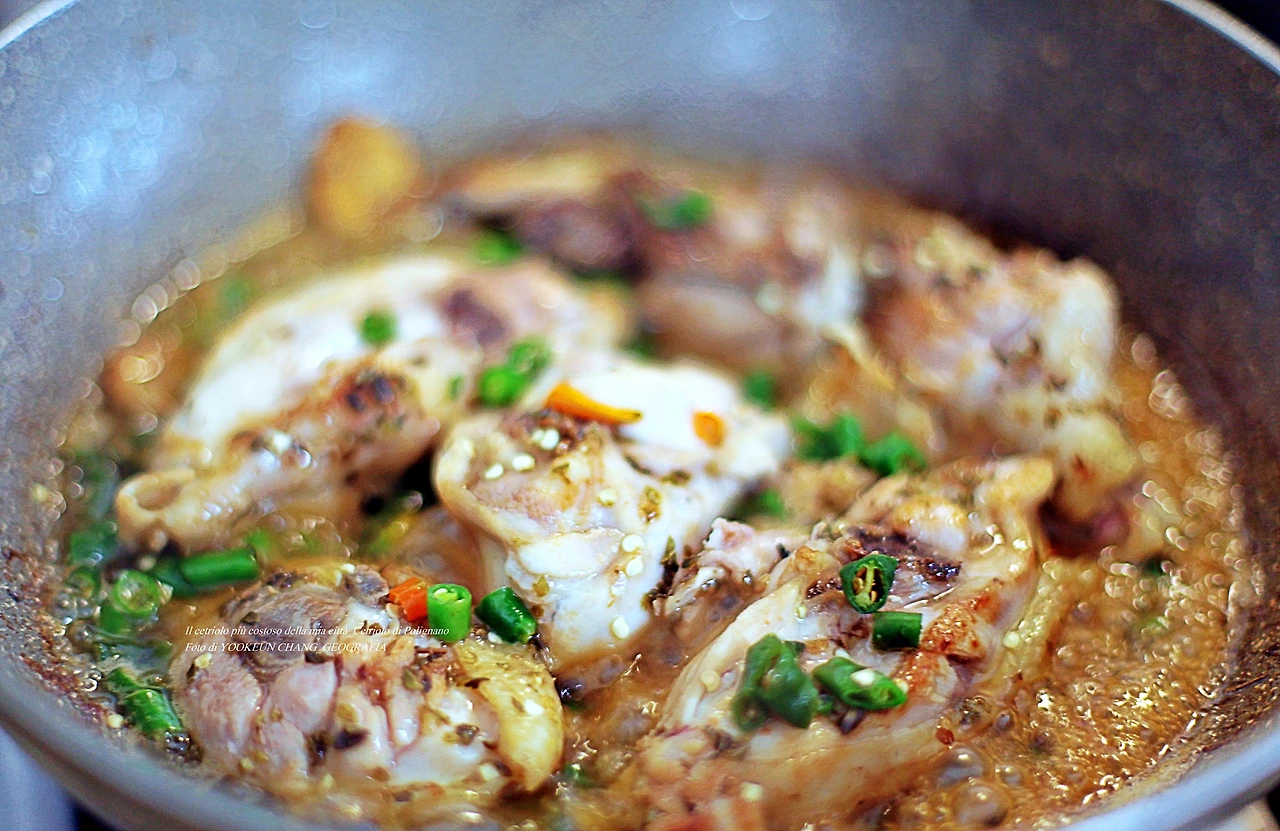 먹음직스러운 비주얼의 딝봉요리 리체타는 간단하다. 먼저 팬 위에 올리브유를 두르고 마늘 적당량을 투입한 후 마늘 기름을 만든다. 센 불이다. 그리고 준비한 닭봉을 올려놓는다.(치익~~) 그다음 쏭쏭 총총 썰어둔 청양고추를 식 미 껏 흩뿌린다. (지글지글~) 여전히 센 불이다. 그다음 준비해 둔 뷔노 비앙꼬 반 컵 분량을 붓고(치익~~) 뚜껑을 덮는다. 가끔씩 고루 익도록 뒤집어준다. 그런 잠시 후(대략 1분 경과) 오리가노를 흩뿌리고 닭봉이 다 익었을 즈음에 소금 후추로 간을 한다. 끝! 이런 과정 일부를 뚜껑을 열어 영상에 담았다.