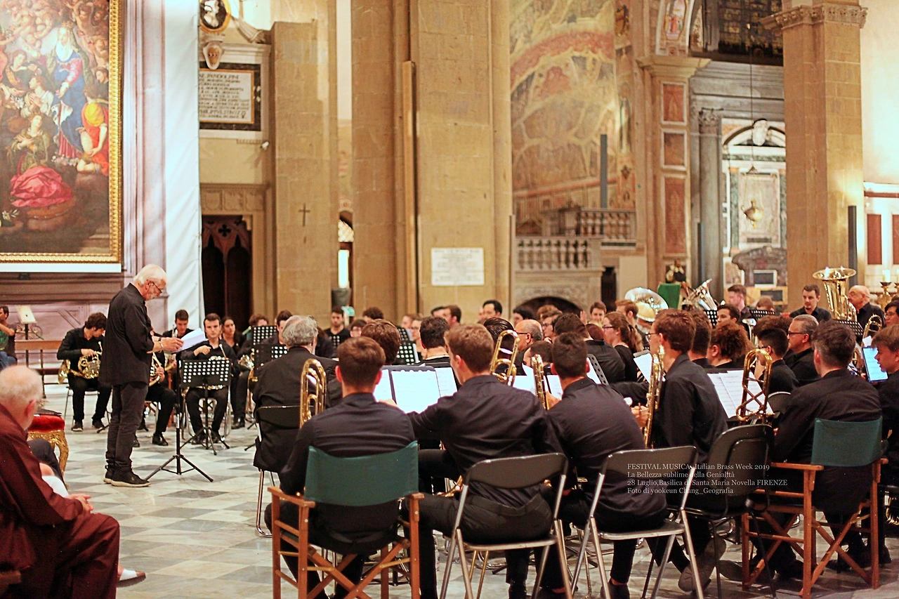 지난주 일요일(28일, 현지 시간) 오후 9시경 르네상스의 고도 피렌체의 관문인 산타 마리아 노벨라 역 앞에 위치한 산타 마리아 노벨라 성당(Basilica di Santa Maria Novella)에서 브라스 밴드 음악 축제(L’ITALIAN BRASS WEEK 2019 – LA BELLEZZA SUBLIME DELLA GENIALITÀ)가 열렸다.