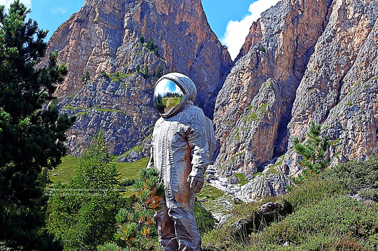 하니와 나는 꼴포스꼬 알타바디아(Colfosco Alta Badia) 하이킹 루트를 걷다가 묘한 풍경을 만나게 됐다. 그곳에는 한 우주인이 소나무로 조각되어 있었는데 달 탐사를 나선 우주인의 모습을 닮았다.
