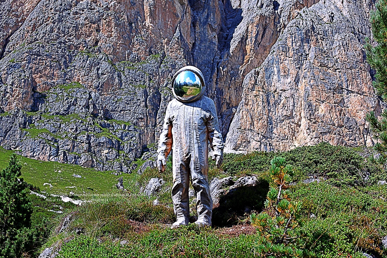 그런 한편 누군가 고사목을 이용해 조각한 우주인의 모습 때문에 외계인이 단박에 떠 올랐다. 그럴 리가 없지만 외계의 생명체가 신세계를 찾아 태양계까지 진출했거나 불시착하면서 돌로미티에 첫 발을 디딘 것이라는 생각을 하게 된 것이다. 나는 누군가의 이런 상상이 절묘하다는 생각을 했다.
