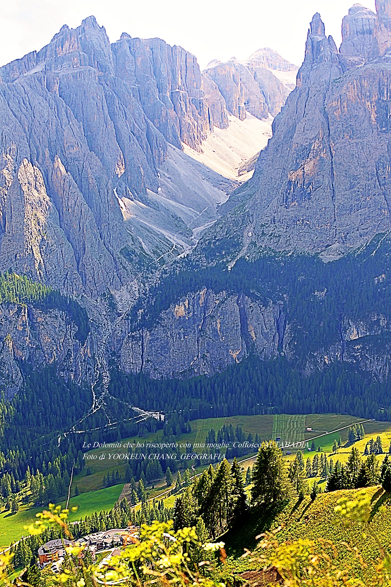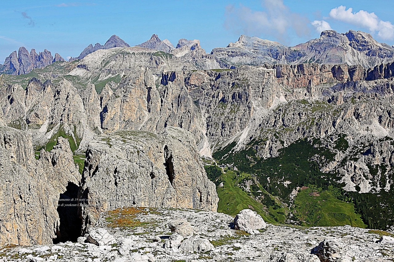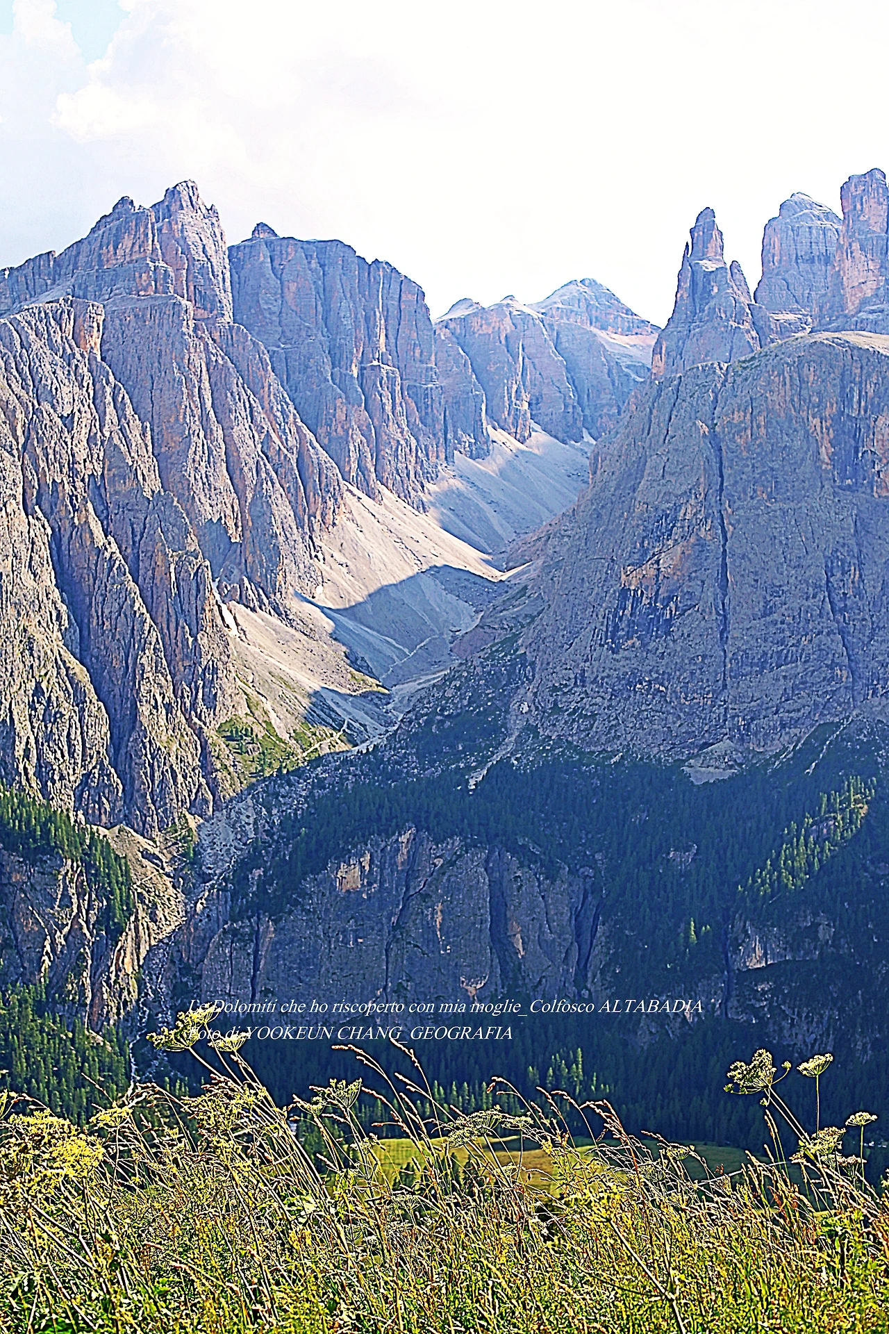 삐쉬아두 정상에서 보면 뿌에즈 오들레(Parco naturale Puez-Odle)의 모습은 이렇게 보인다. 실로 장엄하고 신비로운 비경이 눈높이에 맞추어 펼쳐져 있는 것이다. 광활하게 펼쳐져 있는 암봉 아래 수목한계선으로 꼴포스꼬 알타바디아(Colfosco Alta Badia) 하이킹 루트가 길게 이어져 있는 것이다.