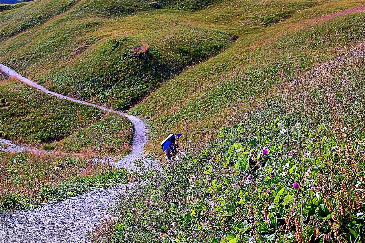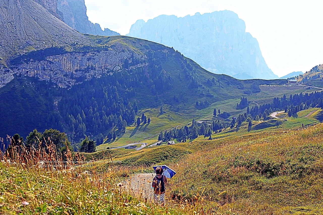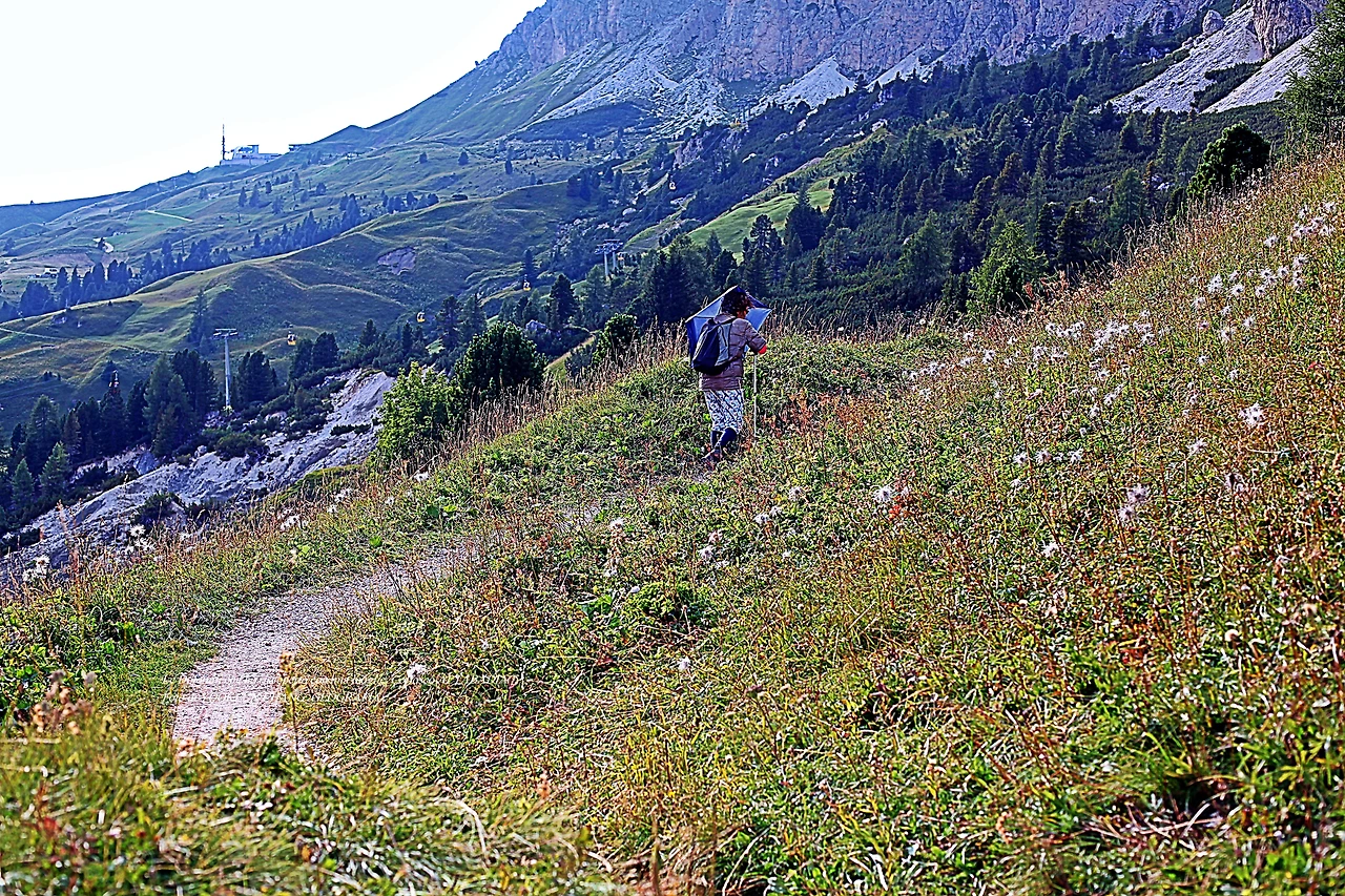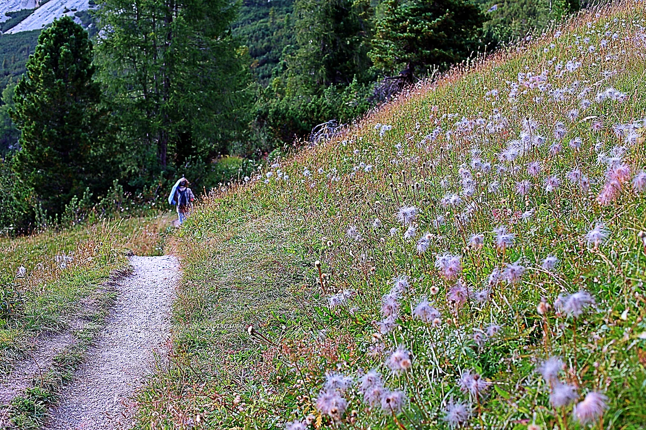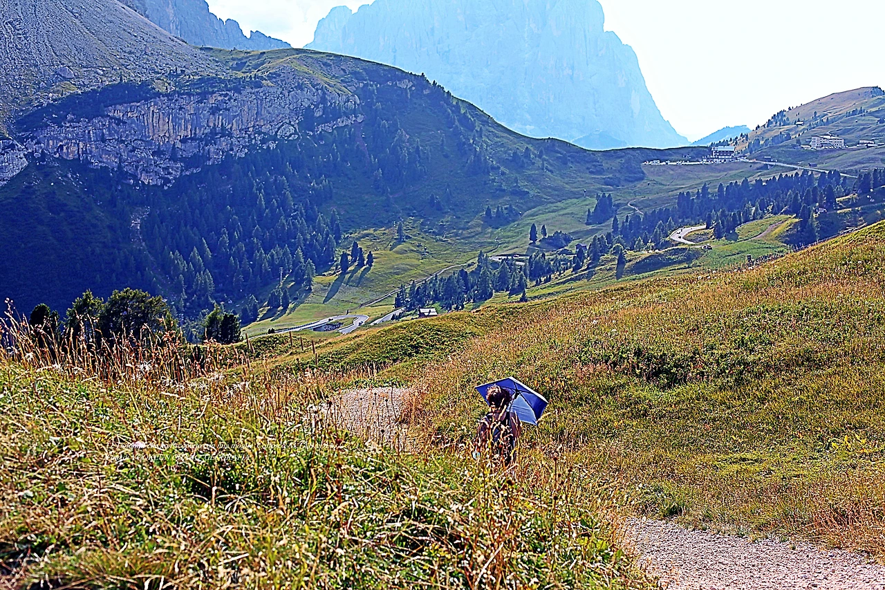 다시 방문한 돌로미티에서 처음으로 시도한 하이킹은 대략 1600m의 해발고도를 이루고 있는 곳이며, 빠쏘 가르데나(Passo Gardena) 9부 능선에서 시작되고 있었다. 우리는 그곳에 주차를 해 두고 오후 시간에 하이킹을 감행한 것이다. 오후 햇살이 따뜻하게 쬐고 있는 하이킹 루트.. 그녀가 저만치 앞서 걷고 있다.
