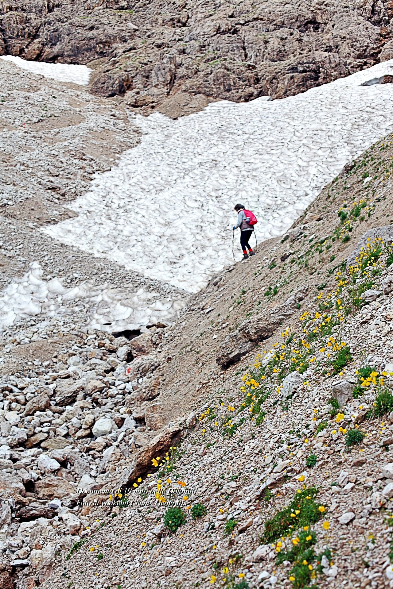 돌로미티 삐쉬아두 정상으로 이어지는 트래킹 루트 옆으로 샛노란 꽃양귀비가 빼곡하다. 그녀는 등산용 스틱 대신 돌로미티에서 임시방편으로 주운 나무 작대기 두 개에 몸을 의지하고 있었다. 그녀 앞에 잔설이..!