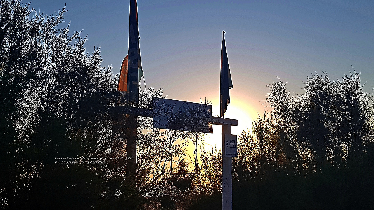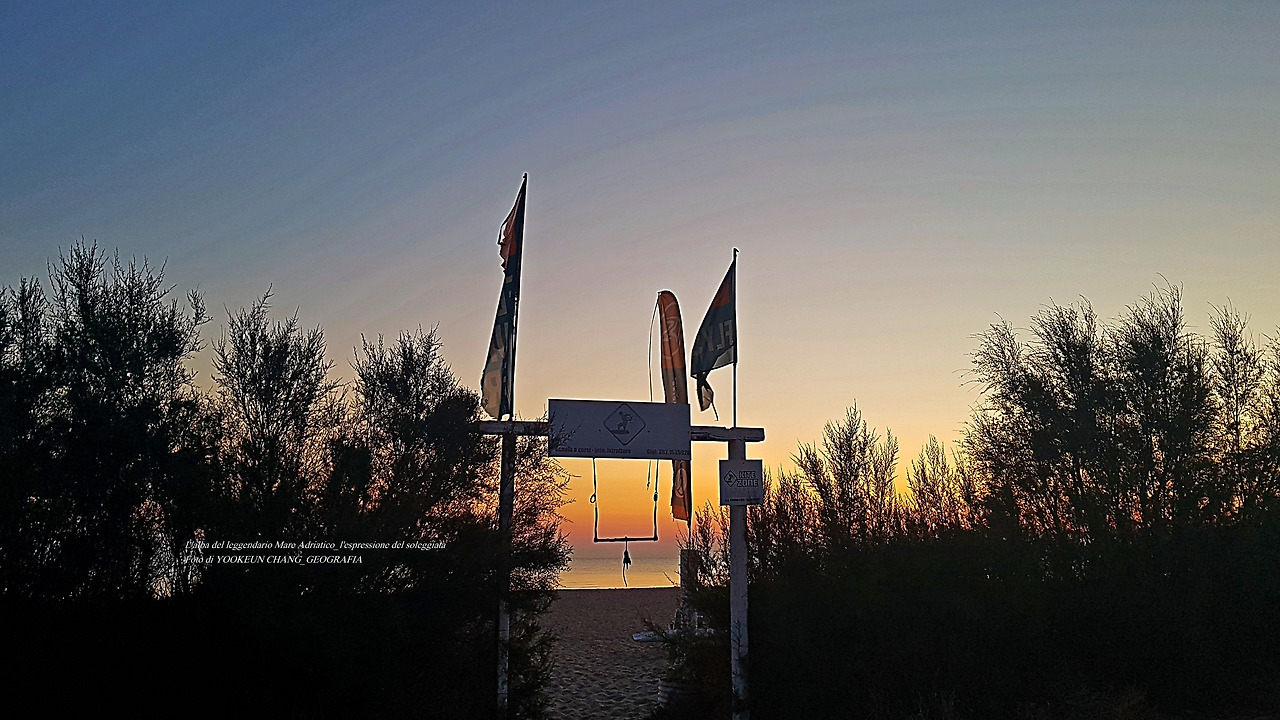 아드리아해 바닷가 윈드서핑 교실이 열리는 이곳은 해돋이 시작을 알리는 바로미터(장소)로 삼았다. 오갈 때 풍경이 서로 다르다.
