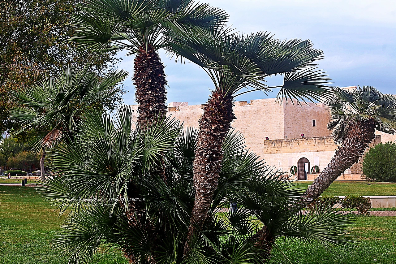 종려나무 여러 그루가 한 몸이 되어 있는 풍경 뒤로 반듯한 성 Castello di Barletta)이 보인다. 우리 집에서 200m 정도 지근거리에 위치한 집 앞 공원의 풍경이다. 서기 2021년 11월 4일 오후, 하니와 함께 바닷가에 들렀다가 집으로 돌아오는 길에 잠시 공원에 들러 쉬다가 곁에 위치한 바를레타 두오모(Basilica Cattedrale Santa Maria Maggiore)로 향했다.