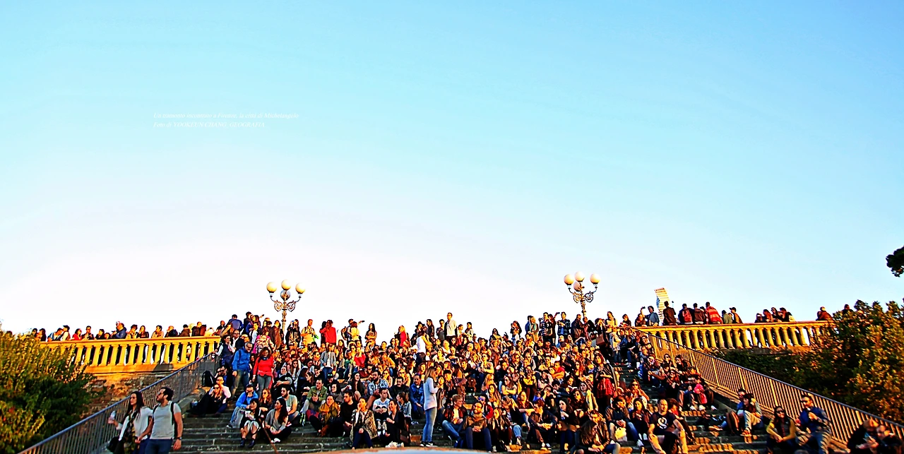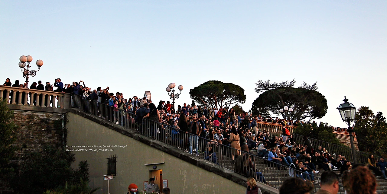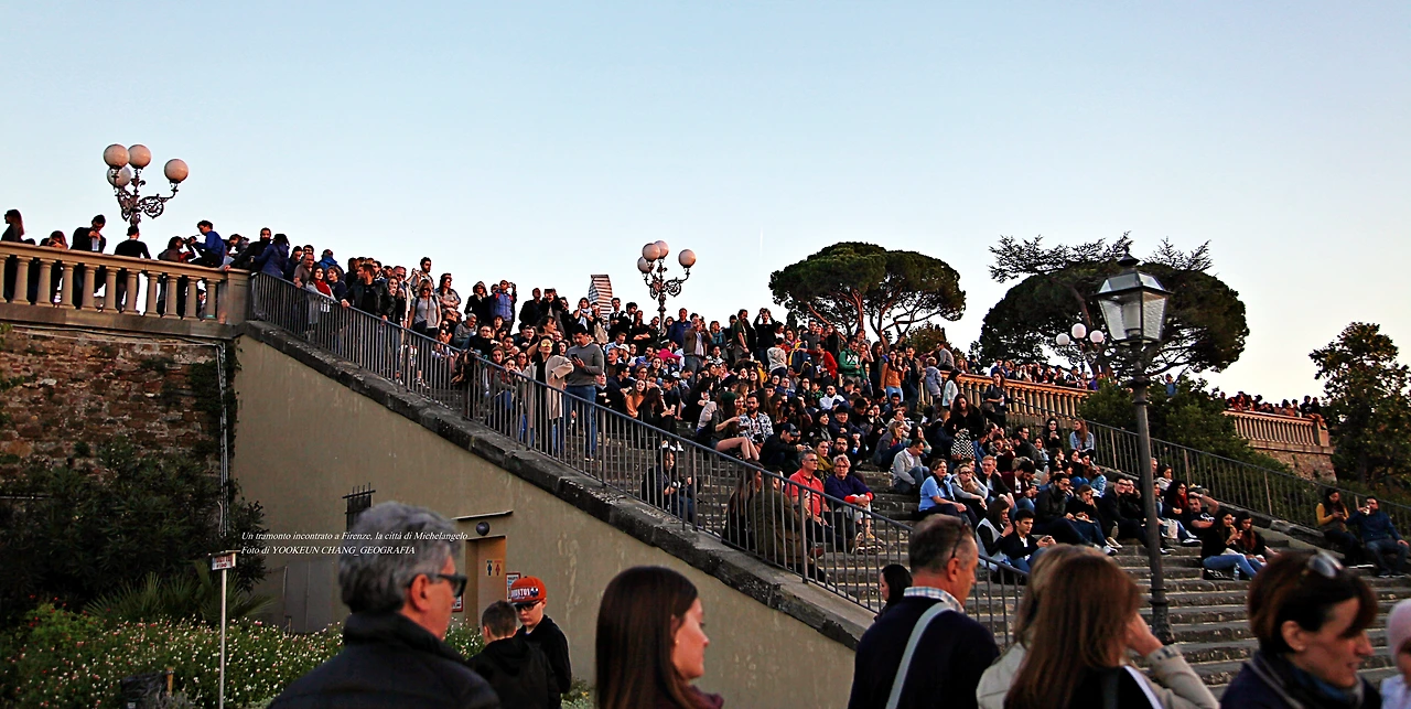 사람들이 계단에 모여 앉아 있는 이곳은 르네상스(Rinascimento)의 고도 퓌렌쩨(Firenze. 피렌체라고 읽지 않고 '퓌렌쩨'로 읽었다)의 미켈란젤로 광장(Piazzale Michelangelo)이다.