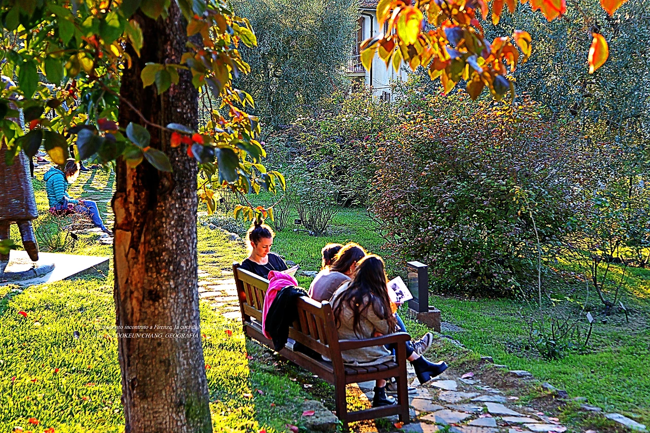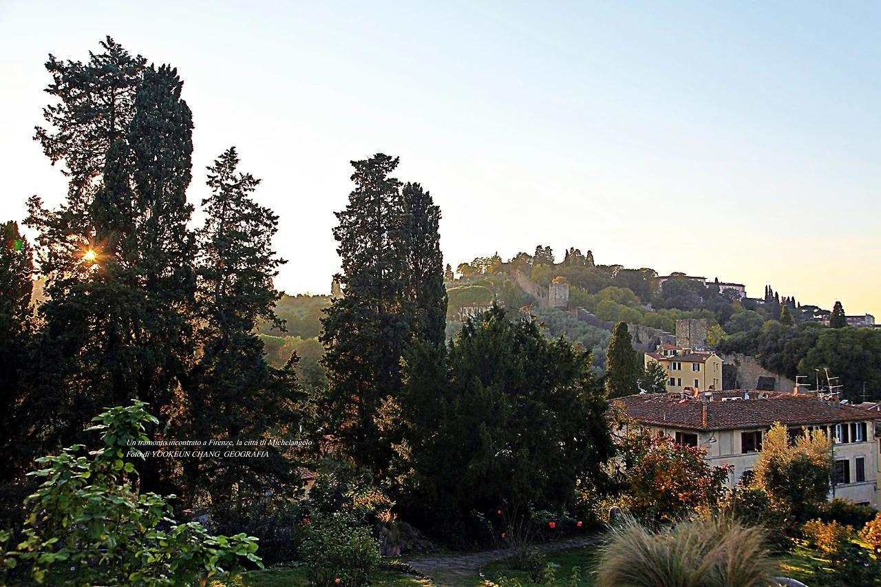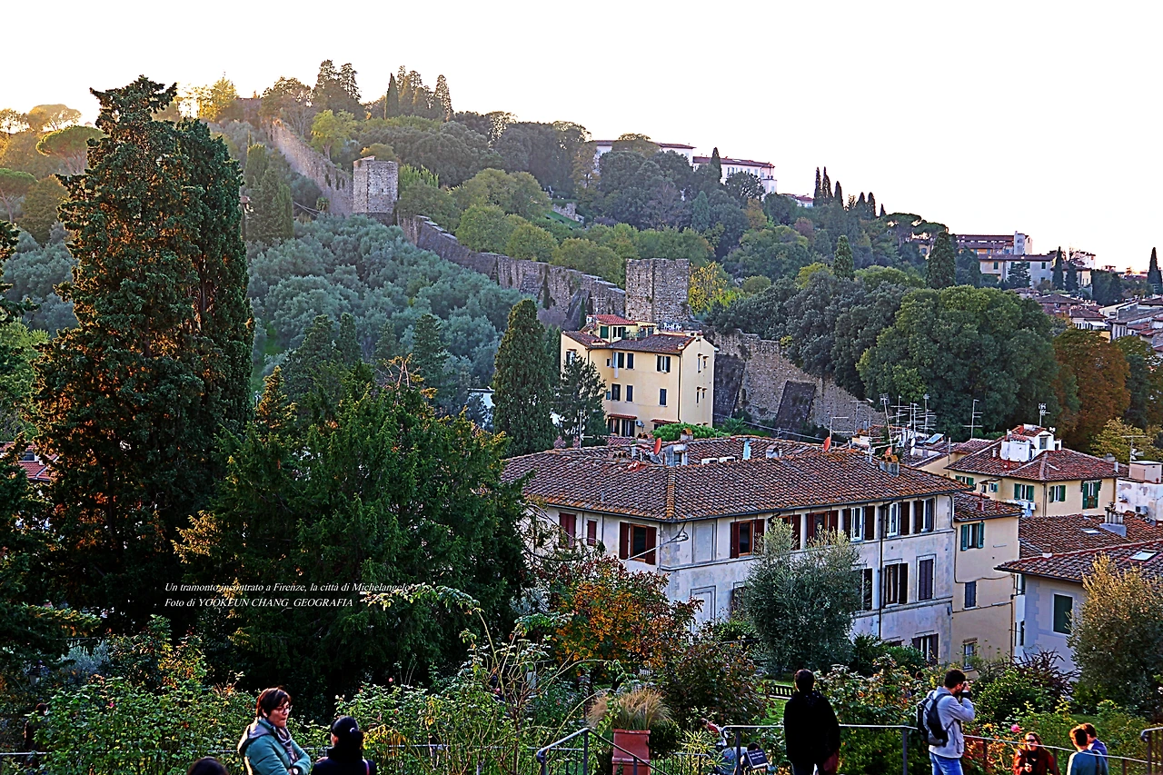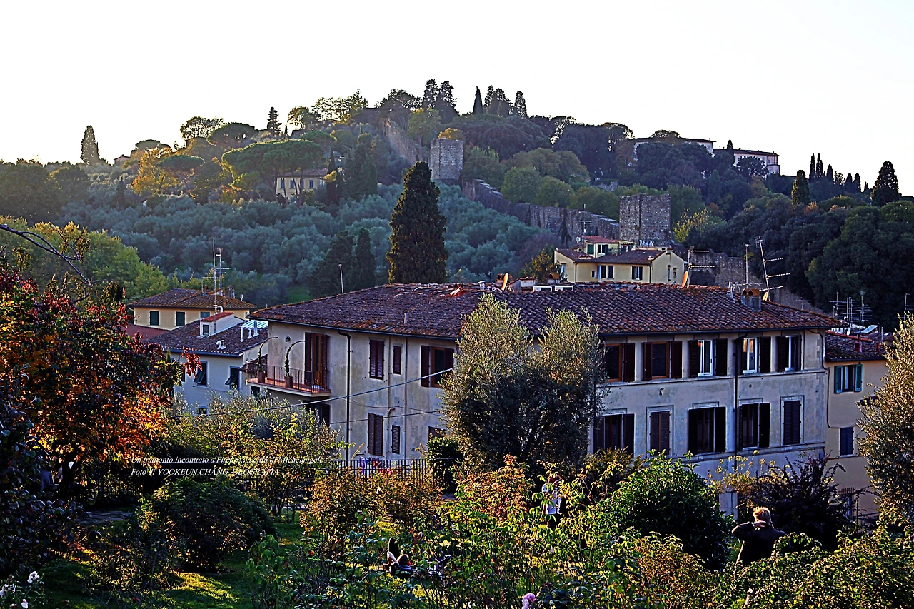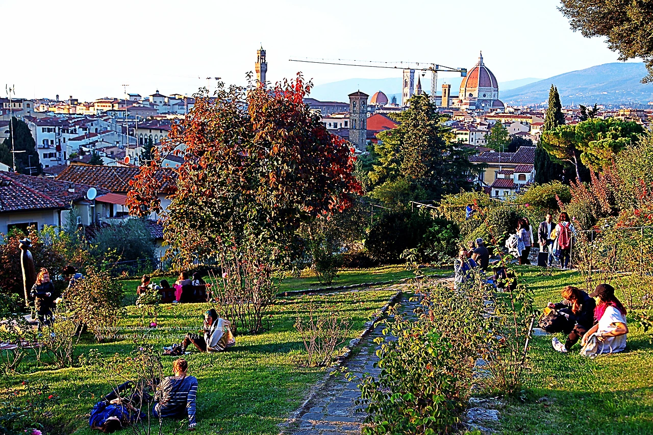 황금빛 갈 햇살이 마구 쏟아지는 이곳은 르네상스의 고도 퓌렌쩨의 미켈란젤로 광장 바로 아래에 위치한 장미들의 정원(Giardino delle Rose)이다. 시내 중심에서 뽄떼 베끼오 다리를 건너 아르노 강(Fiume arno)을 좌측으로 끼고 남동쪽으로 이동하여 뽀르따 산 미니아또(Porta San Miniato)에 도착하면, 그곳에서 거의 직진으로 미켈란젤로 광장까지 이어지는 언덕길 옆에 위치한 공원이다.