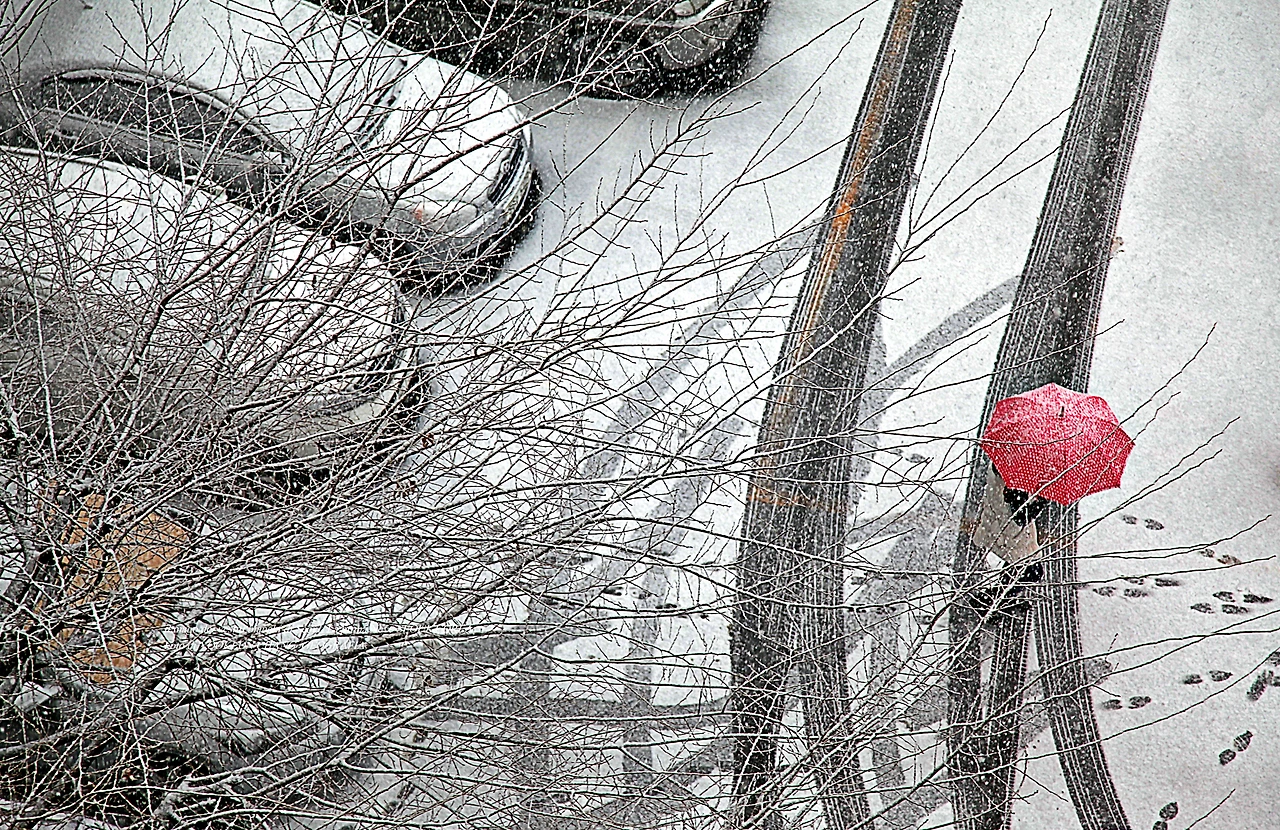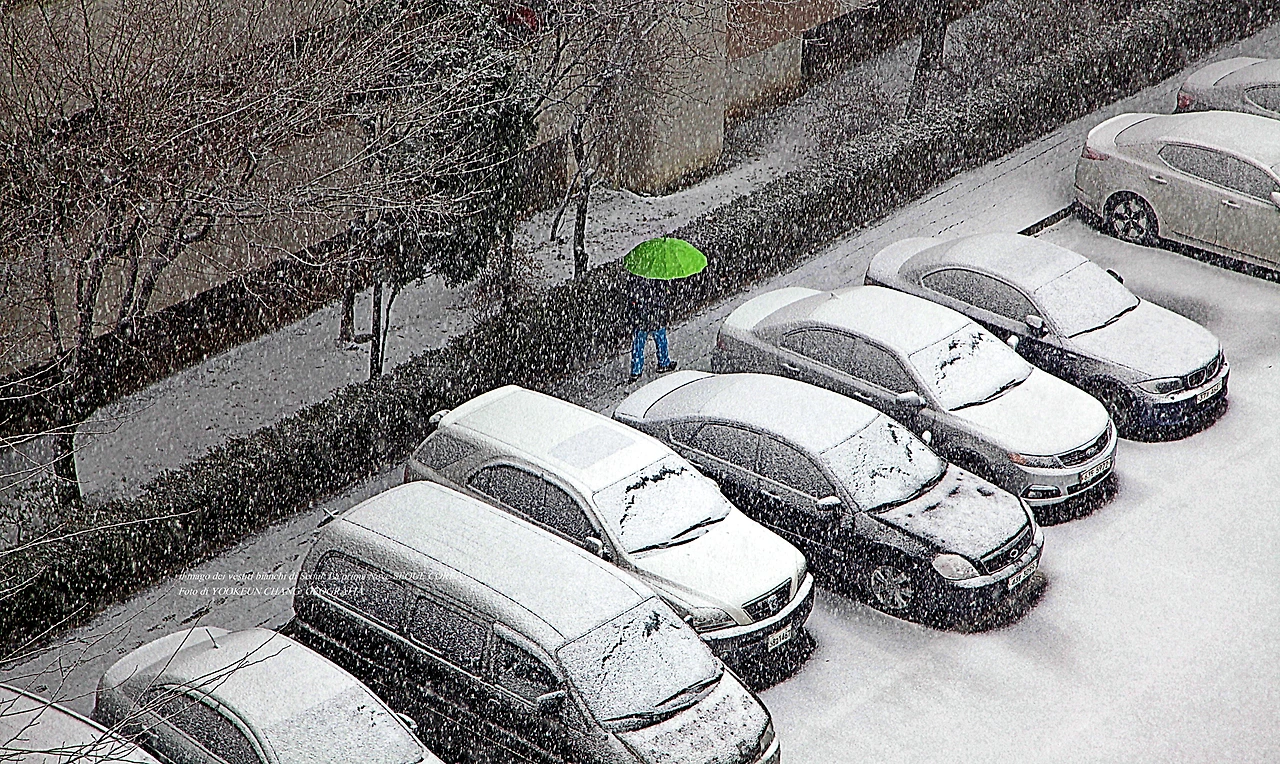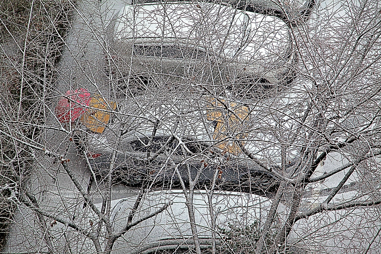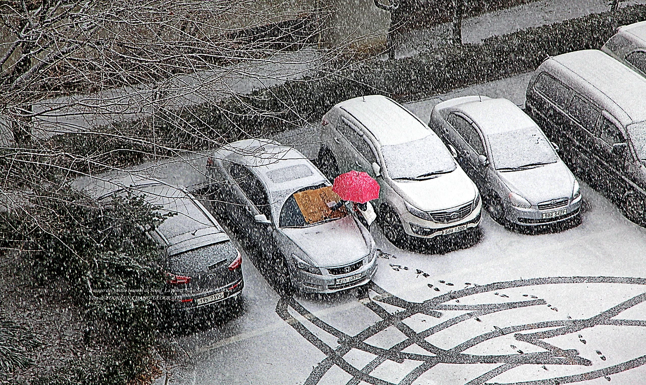 그녀는 종이 상자를 펼쳐서 운전석 앞 차창에 덮었다. 참 흐뭇한 장면이다. 빨간 우산은 첫눈과 웰케 잘 어울리는지.. 시진을 오래도록 찍는 동안 기분이 좋아지는 때는 이럴 때라고나 할까..