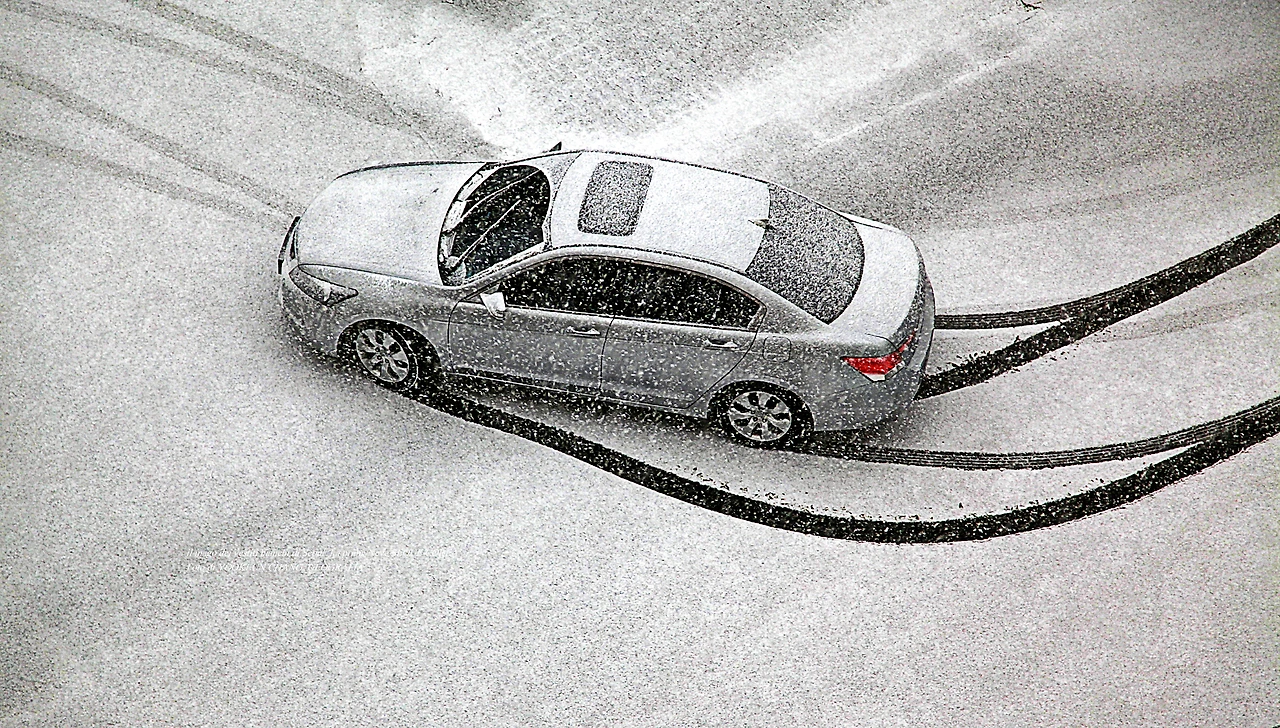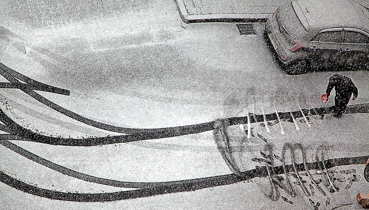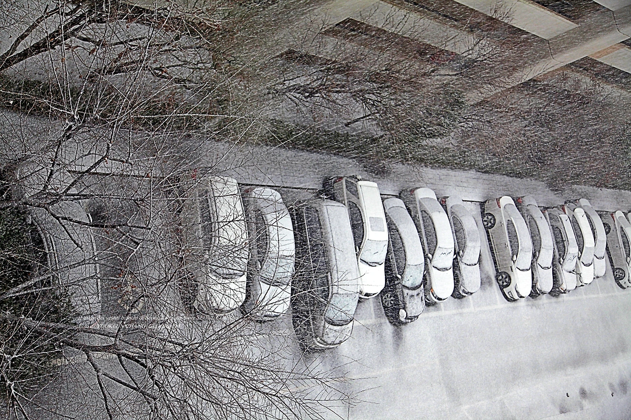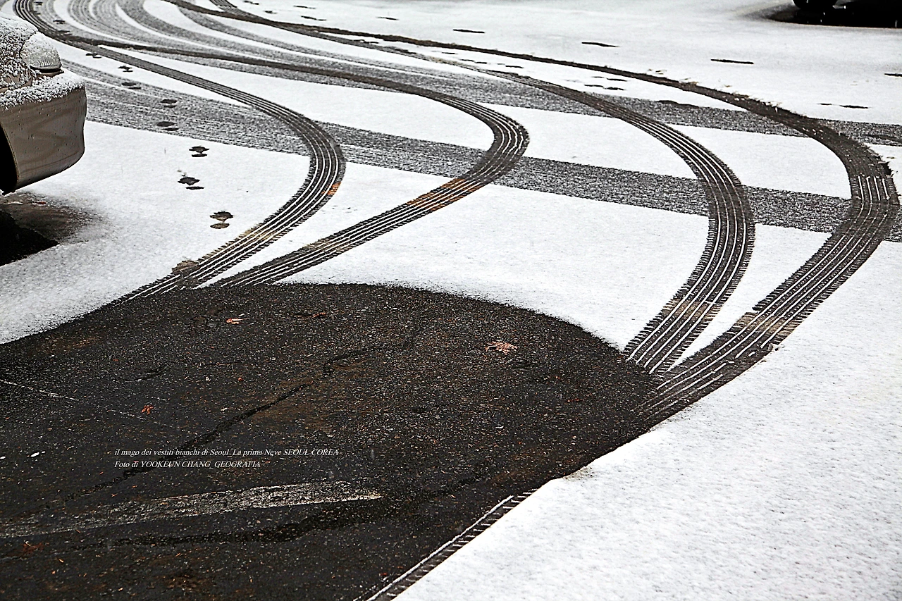 아마도 그는 야근을 하고 새벽에 퇴근을 한 모양이다. 주차 장소를 발견하고 그 즉시 자동차를 돌리고 있는 것이다. 첫눈이 오시자 그의 동선이 아스팔트에 선명하게 묻어났다. 숙련된 운전 솜씨가 바퀴 자국에 묻어났다,