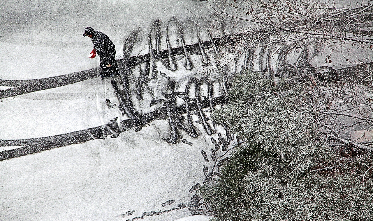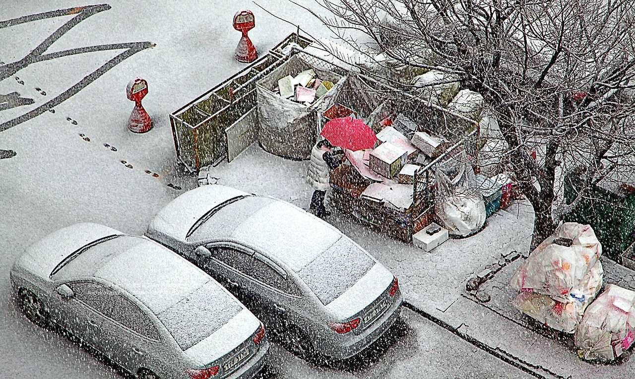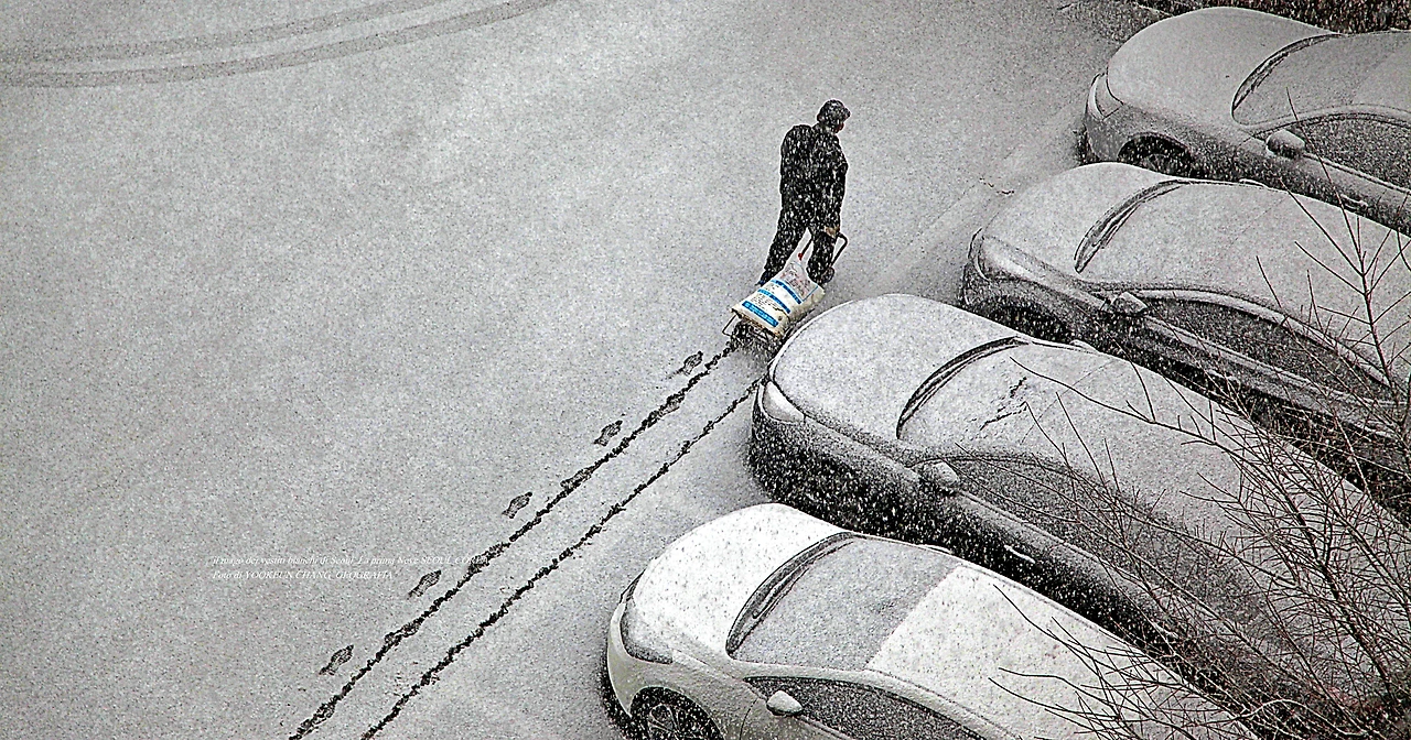수레를 이끌고 첫눈 사이로 천천히 지나가는 사람은 아파트 경비 아저씨다. 당신은 어디로 가시는 것일까..