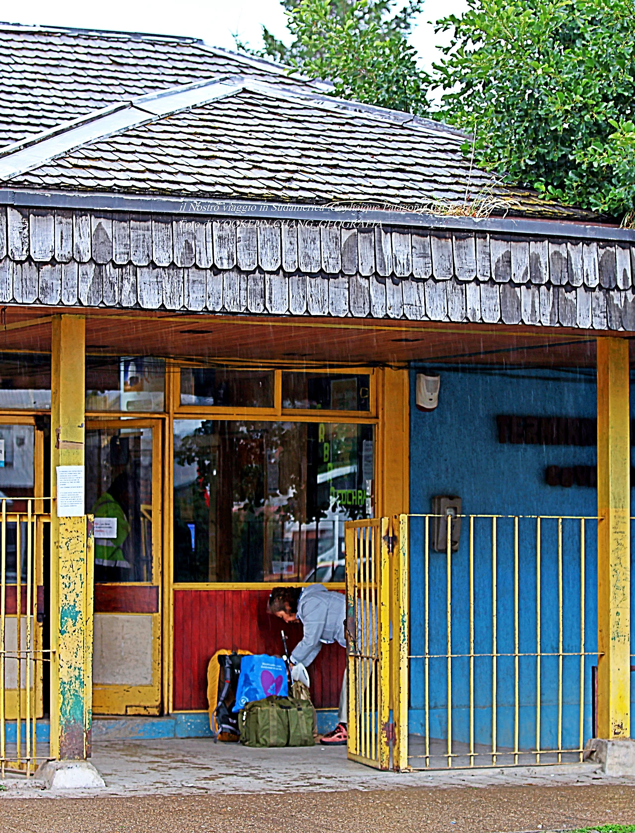 우리는 다시 보따리를 챙겼다. 청춘도 아닌 안청춘이 배낭여행을 떠났으니 무리가 따르지 않았을까.. 60리터짜리 배낭과 20리터짜리 보조 배낭과 하니의 그림도구가 들어있는 가방까지 무게가 나를 짓누른 것이다. 배낭을 짊어지고 한 아이를 안고 다딘 것과 다름없는 강행군을 계속했다. 참 미련한 짓이지..ㅜ 이날 꼬자이께 시외버스 터미널 바깥으로 주룩주룩 비가 내렸다. 잠시 바깥에 두었던 짐을 챙겨 터미널 내부로 옮기고 있는 장면이 기록되어 있다.
