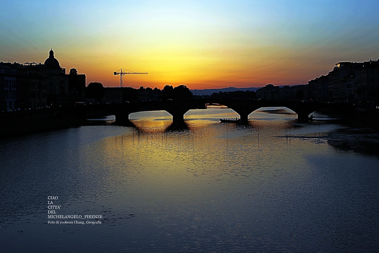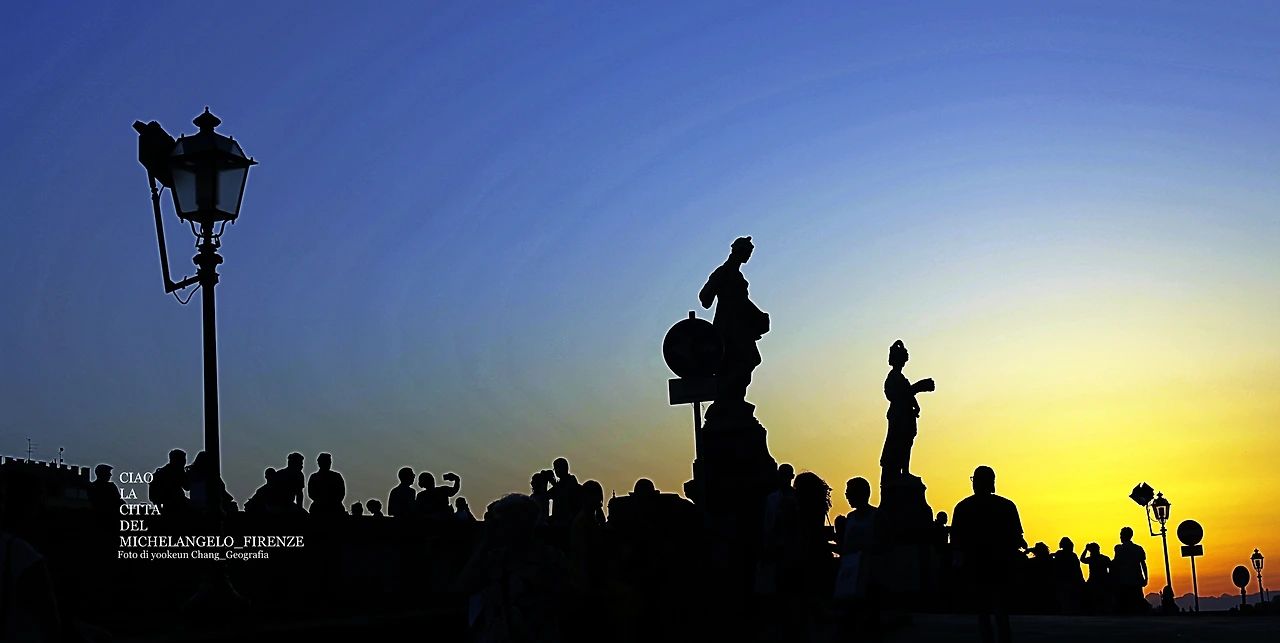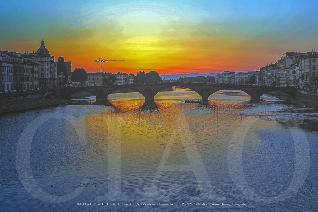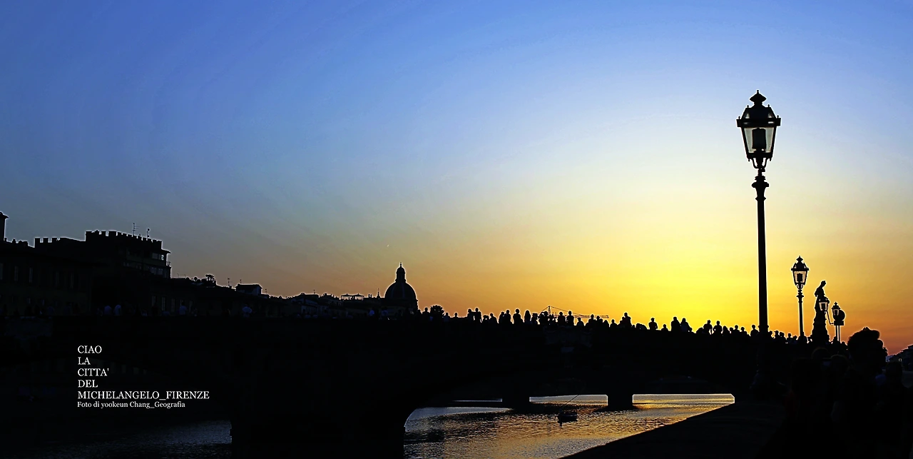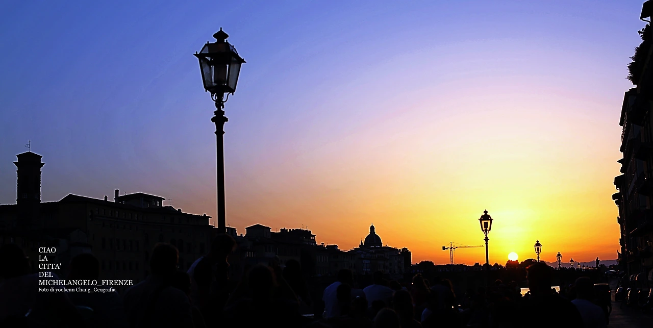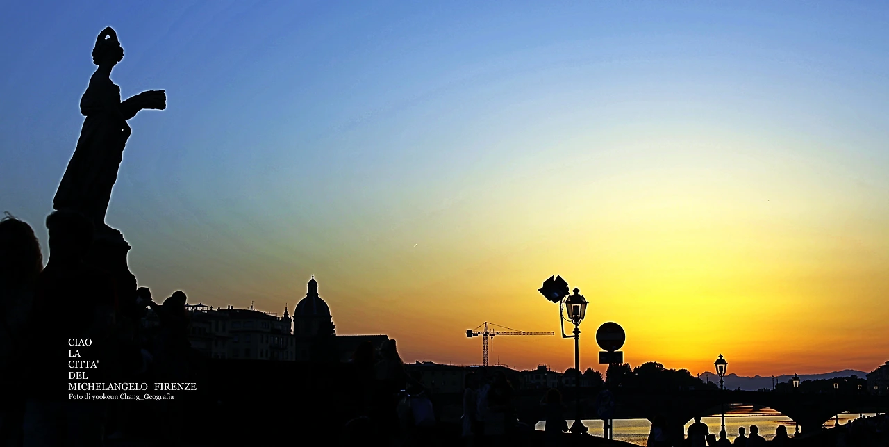 그곳으로 발길을 옮기는데 가슴속에서 알 수 없는 먹먹함이 밀려들었다. 그 이유가 무엇일까 한 이틀 생각해 보니 우리가 너무도 사랑한 도시로부터 멀어지면서 생긴 별리의 한 현상이었다. 그리고 현상이 어디서부터 발현되었는지 곰 되새겨 보니 이탈리아에 둥지를 틀 때까지 죽기 살기로 덤벼든 도전 때문이었을까. 그 힘든 노력 끝에 둥지를 튼 것인데 이 도시를 떠나야 할 일이 생긴 것이다. 마치 목숨을 걸고 사랑한 사람과 생이별하는 느낌이 들었다. 그리고 저만치 멀어지는 저녁나절의 풍경 가운데 나의 눈시울이 비친 아르노 강의 일몰이 보였다. 안녕 내 사랑 미켈란젤로여 피렌체여..!!