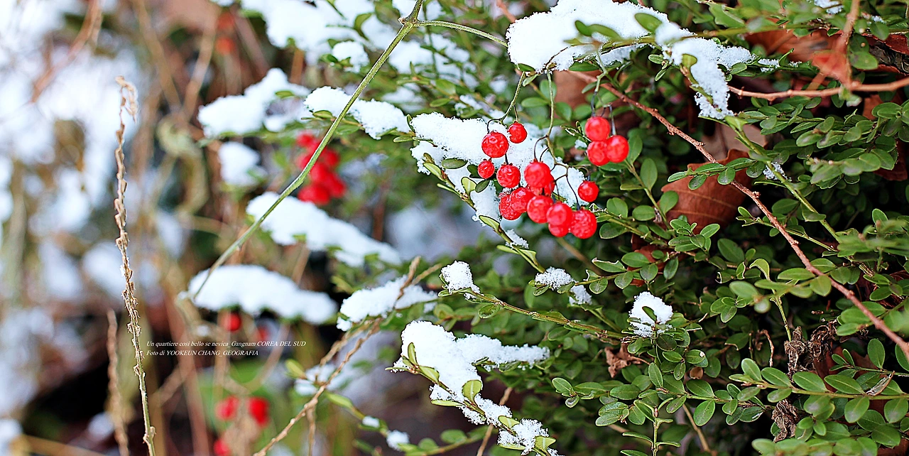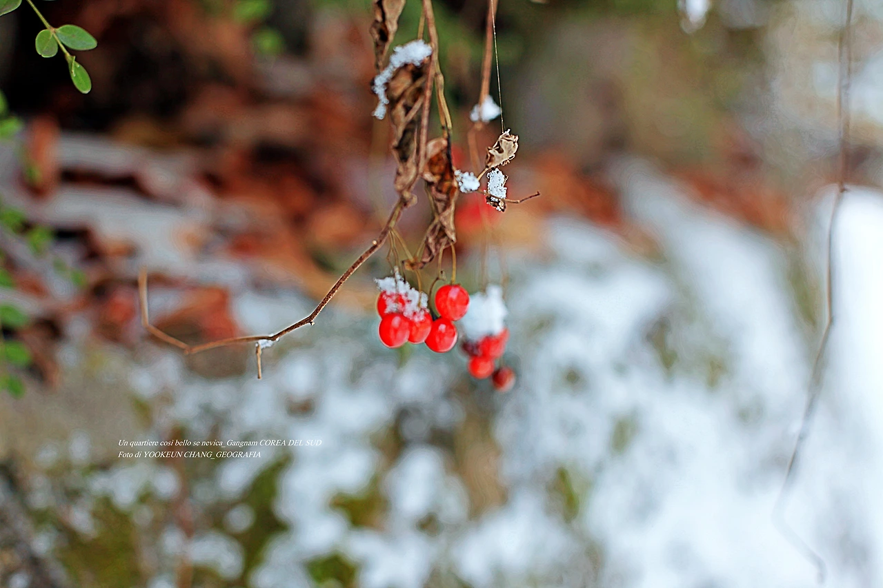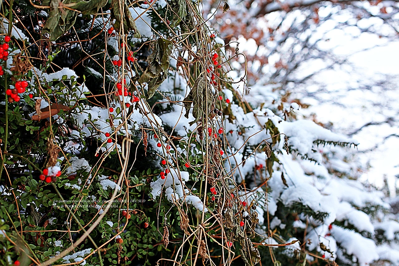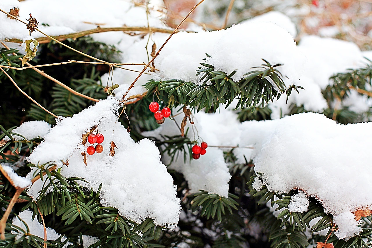 서기 2021년 12월 21일 오전(현지시각), 우리가 살고 있는 이탈리아 남부 뿔리아 주 바를레타에서 서울에 오셨던 첫눈 풍경을 사진첩을 열어 보고 있다. 새하얀 쌀가루를 뿌려놓은 듯 사뿐히 빨간 열매 위에 내려앉은 아름다운 풍경은 흔히 볼 수 없는 진귀한 광경이다.