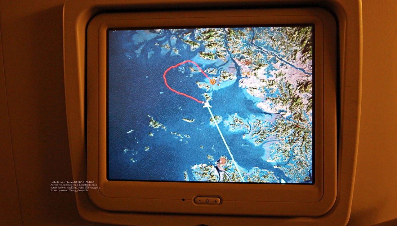 오크랜드 공항으로 다가서는 비행기의 동선이 내비게이션에 나타났다. 이번 여행은 인천공항에서 직항으로 호주까지 남하해 호주에서 오클랜드 공항을 거쳐 다시 대권 항로를 따라 남미 칠레의 수도 산티아고 공항까지 이어지는 긴 시간의 여행이며 파타고니아 투어의 시작이다.
