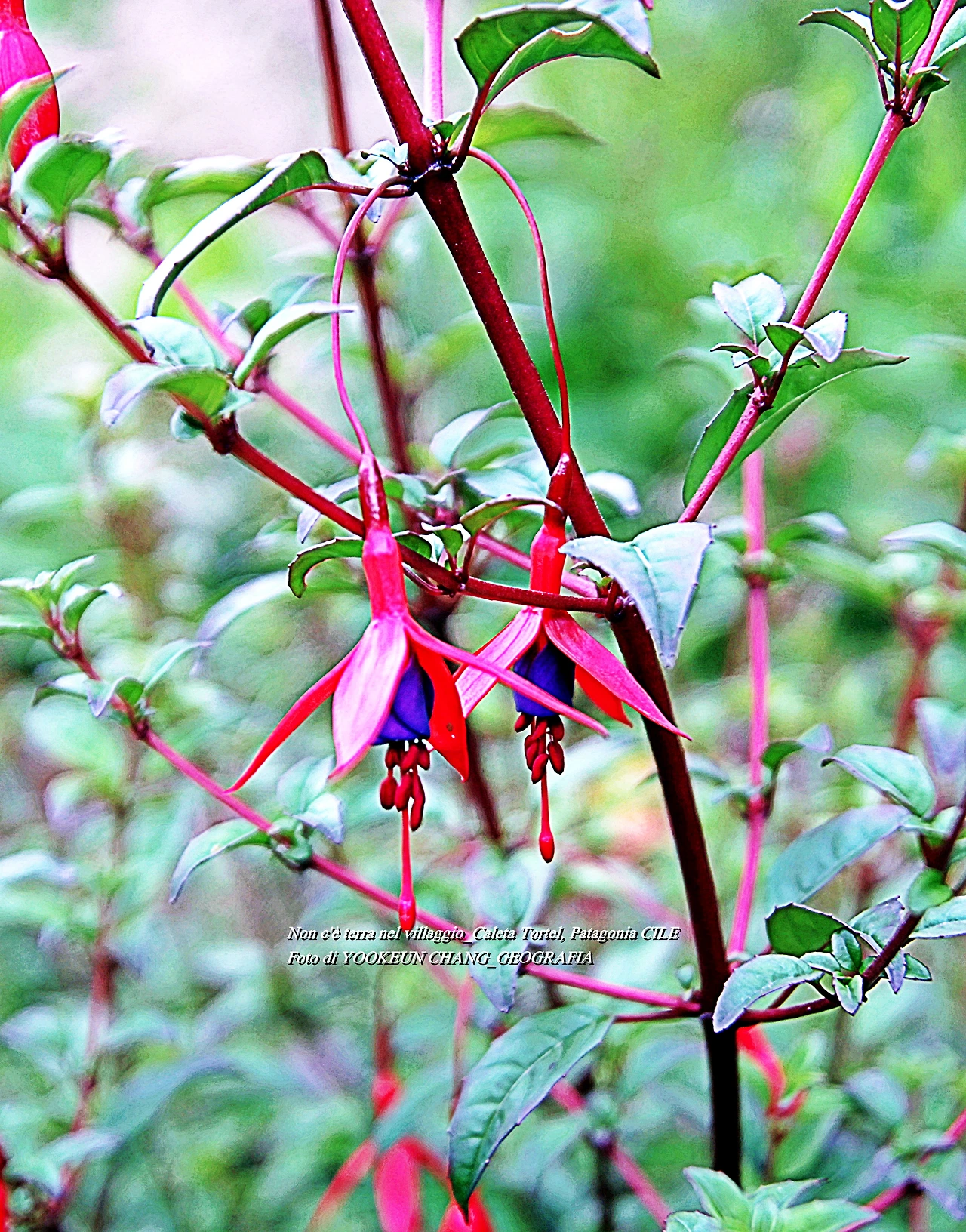 하니가 저만치 앞서 걷는 가운데 싱싱한 자태를 뽐내고 있는 푸시아는 일부러 심은 식물이 아니라 이곳 파타고니아에서 태어나고 자란 식물이며 생김새가 독특하다. 꽃의 생김새가 너무 독특하여 사람들이 재배하기 시작한 식물 푸시아..